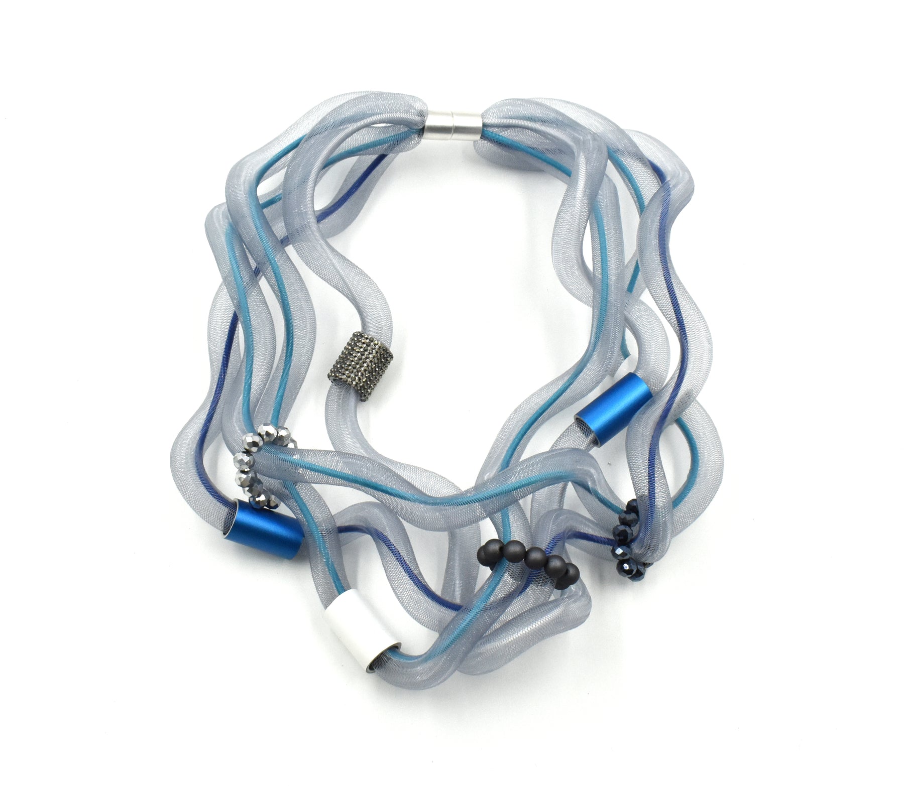 A contemporary statement necklace defined by fluid movement and bold color contrasts. Made from durable cord and finished with anodized aluminium tube elements in multiple tones, this long necklace plays with rhythm, balance, and lightness.