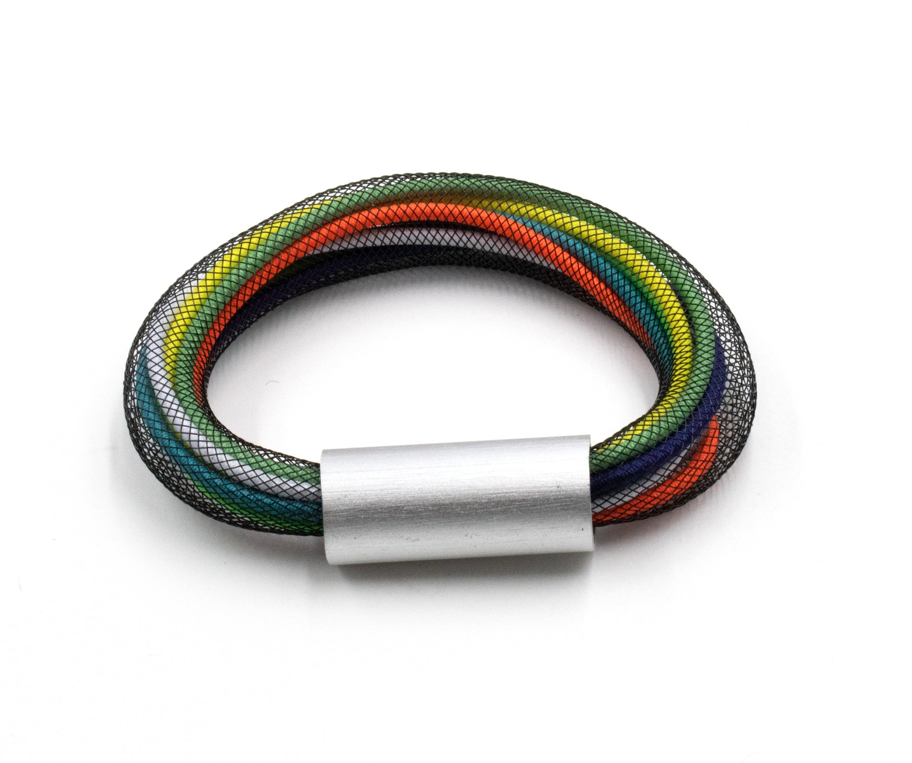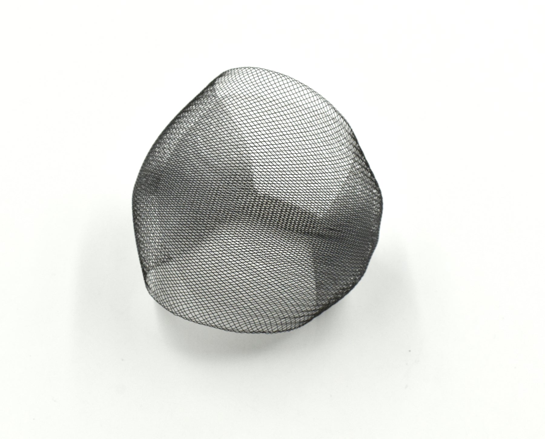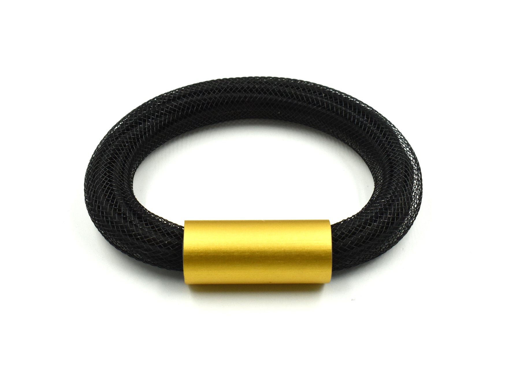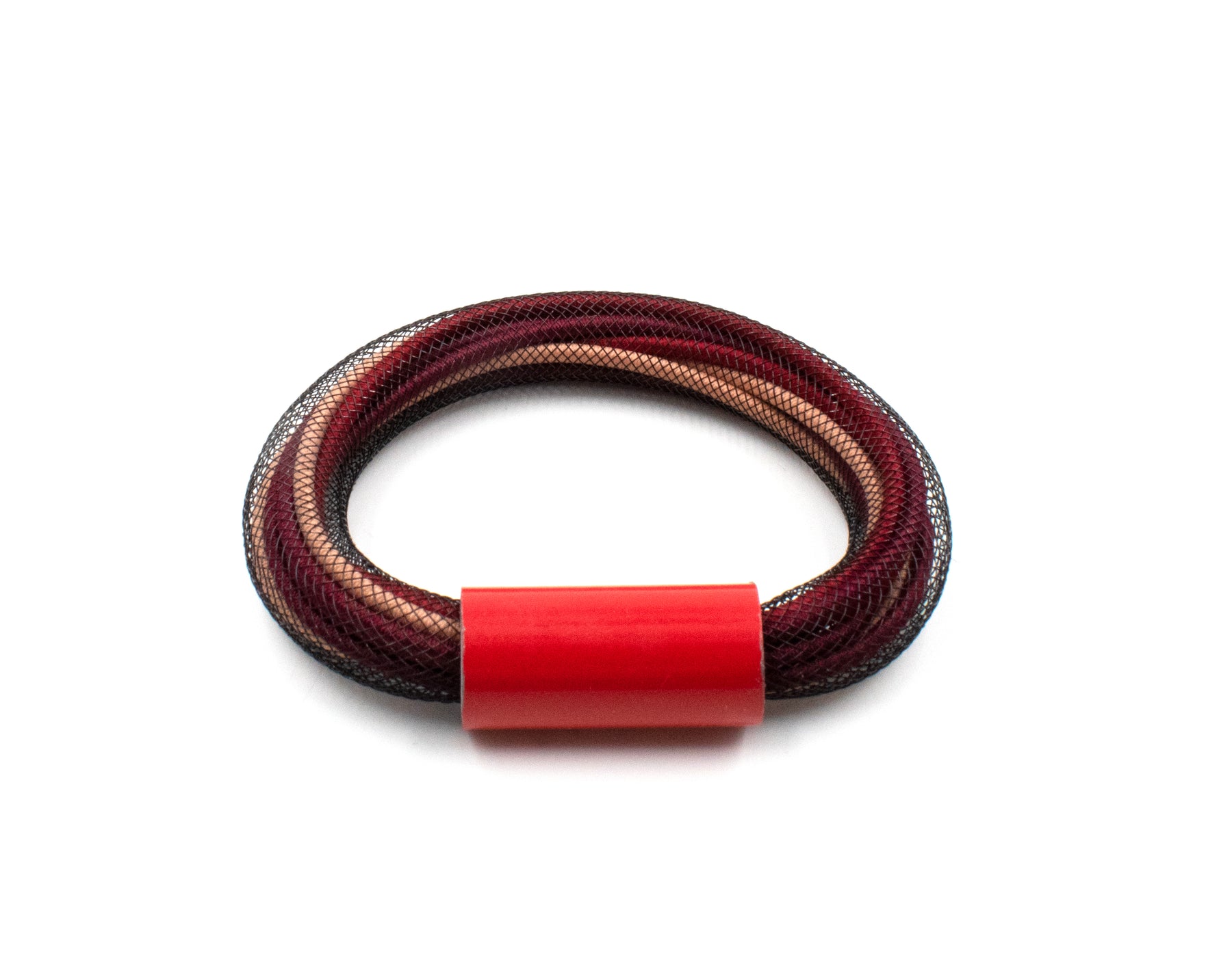 This bracelet is a striking example of contemporary jewelry design, combining lightness with sculptural presence. Crafted from fine mesh material, it creates a voluminous yet airy form that feels bold while remaining comfortable to wear. The semi-transparent texture allows light to pass through, giving the bracelet a dynamic, ever-changing appearance as it moves on the wrist.