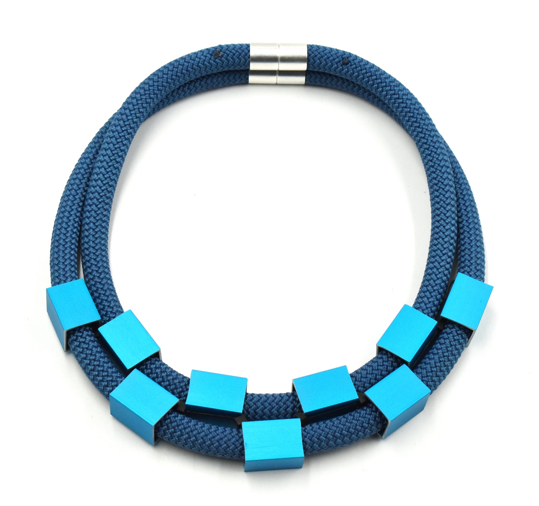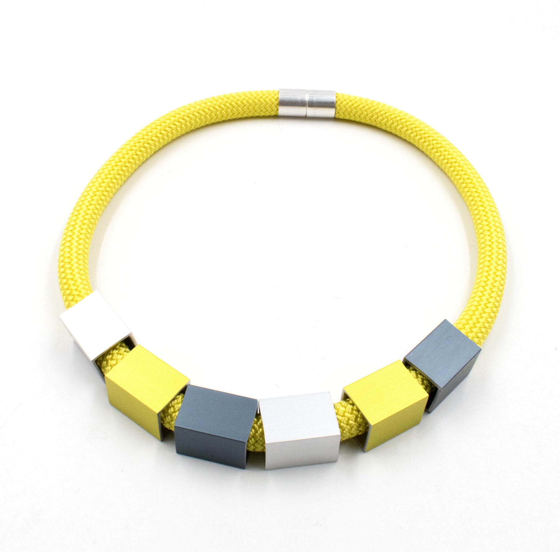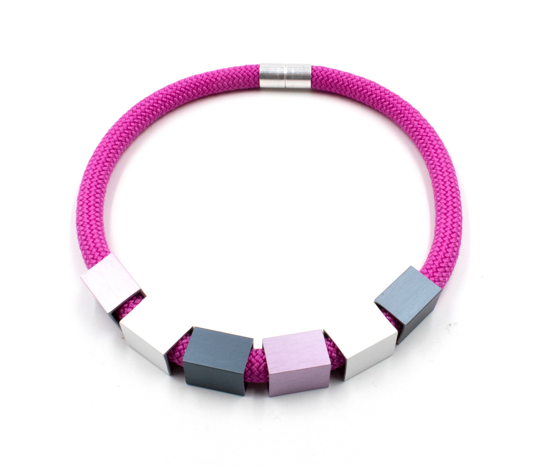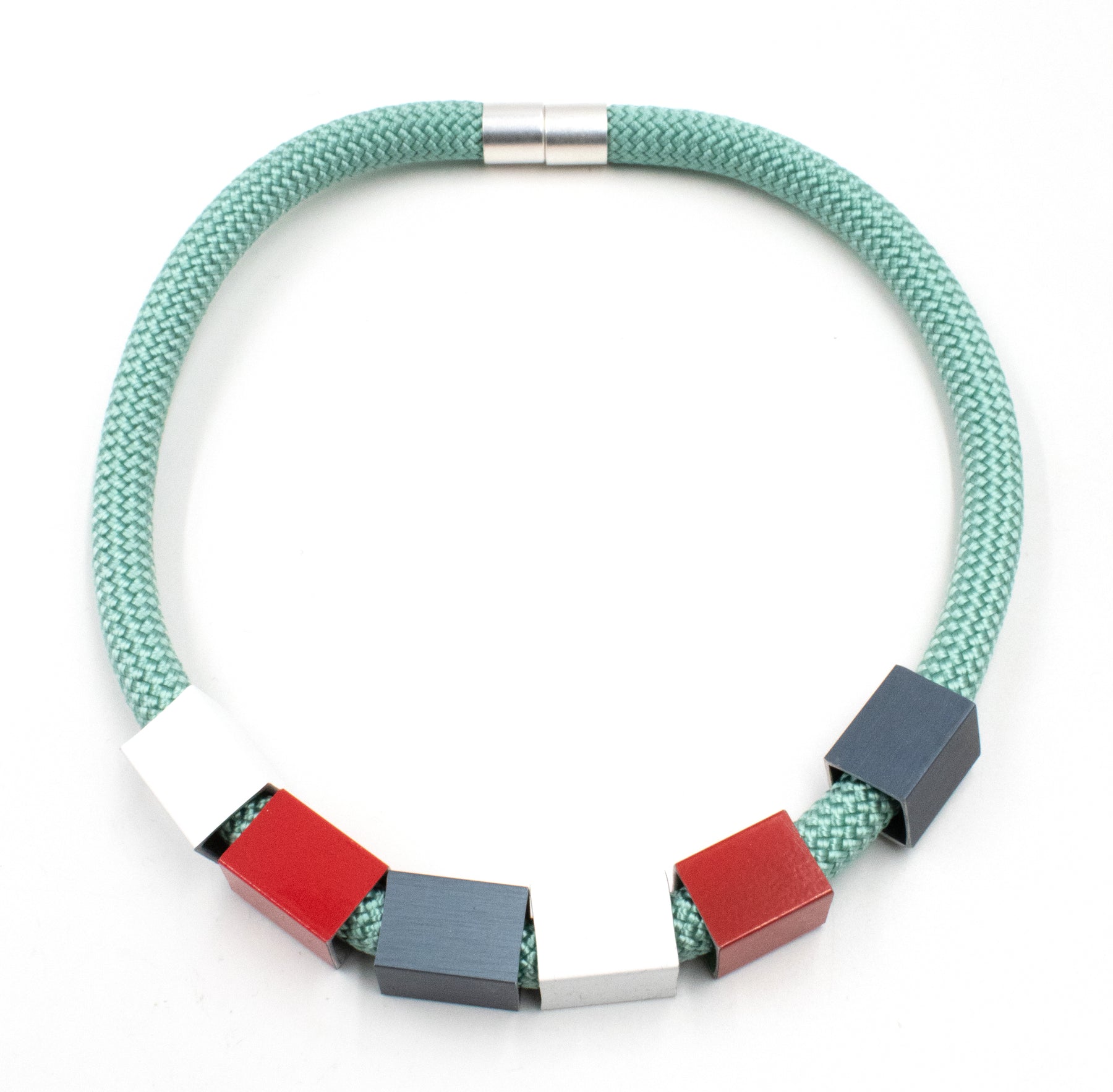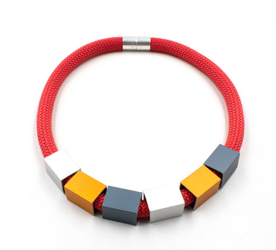 Experience the perfect blend of modern design and vibrant style with the Beyond Simplicity geometric aluminium cubes necklace. This striking necklace showcases a double strand of thick cotton rope, providing both comfort and durability. Adorned with staggered aluminium cubes in a variety of eye-catching color combinations, it adds a dynamic and artistic touch to any outfit.
