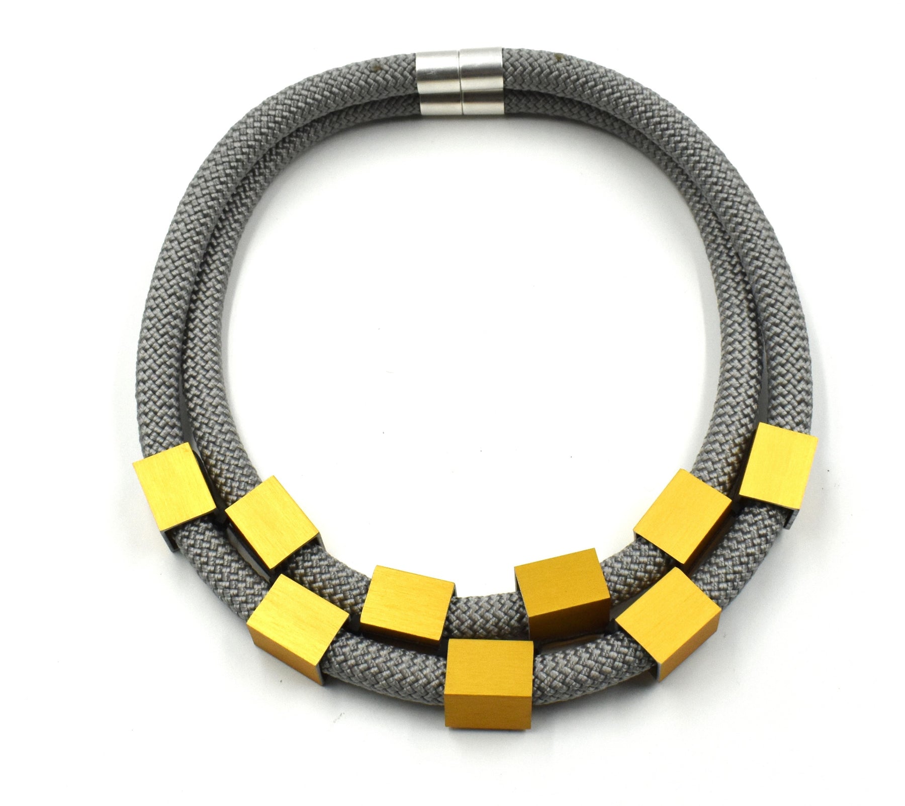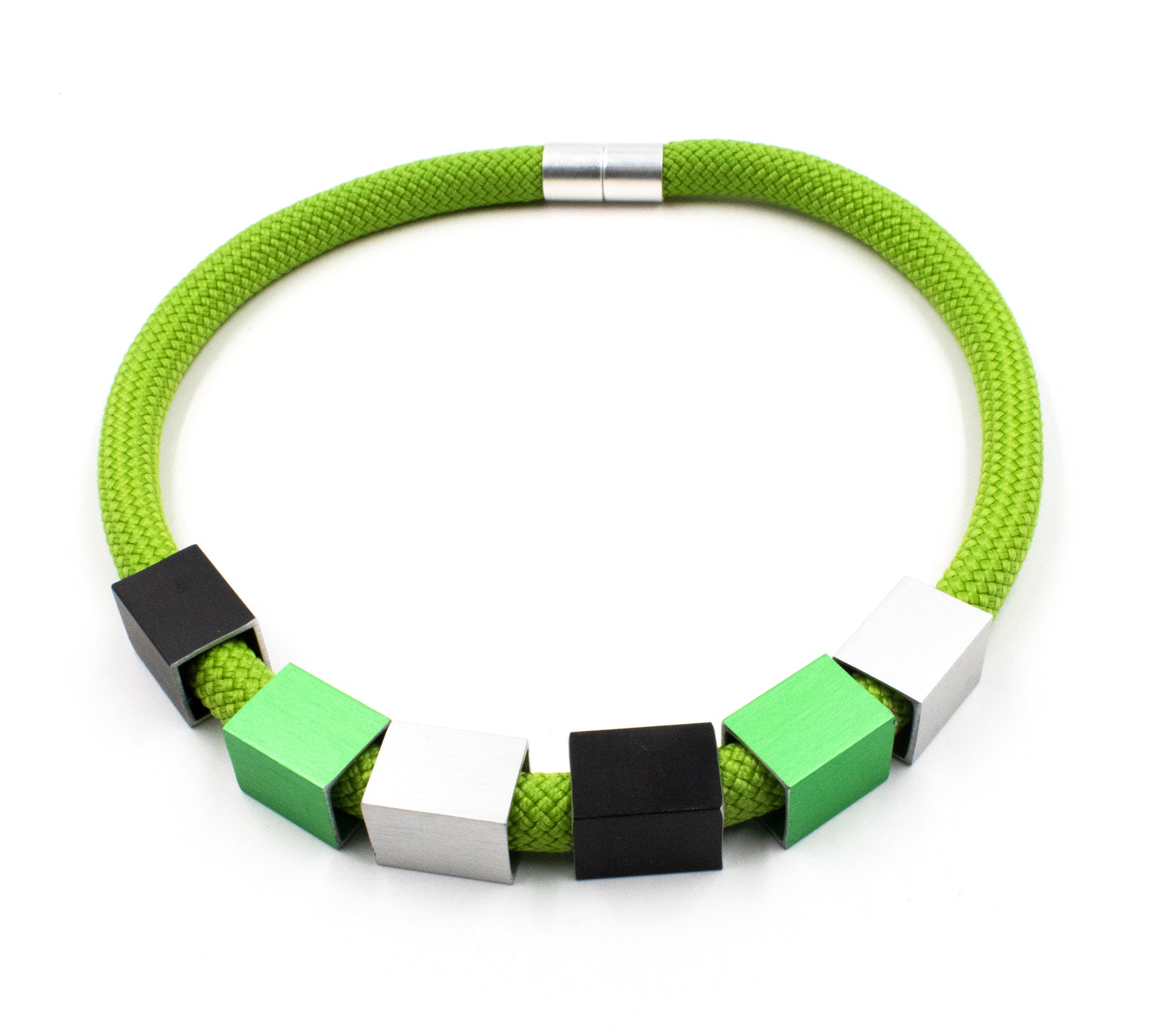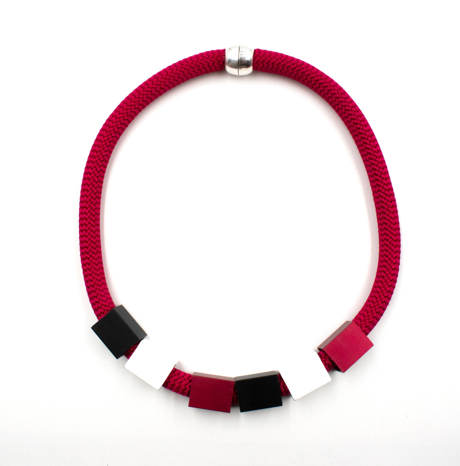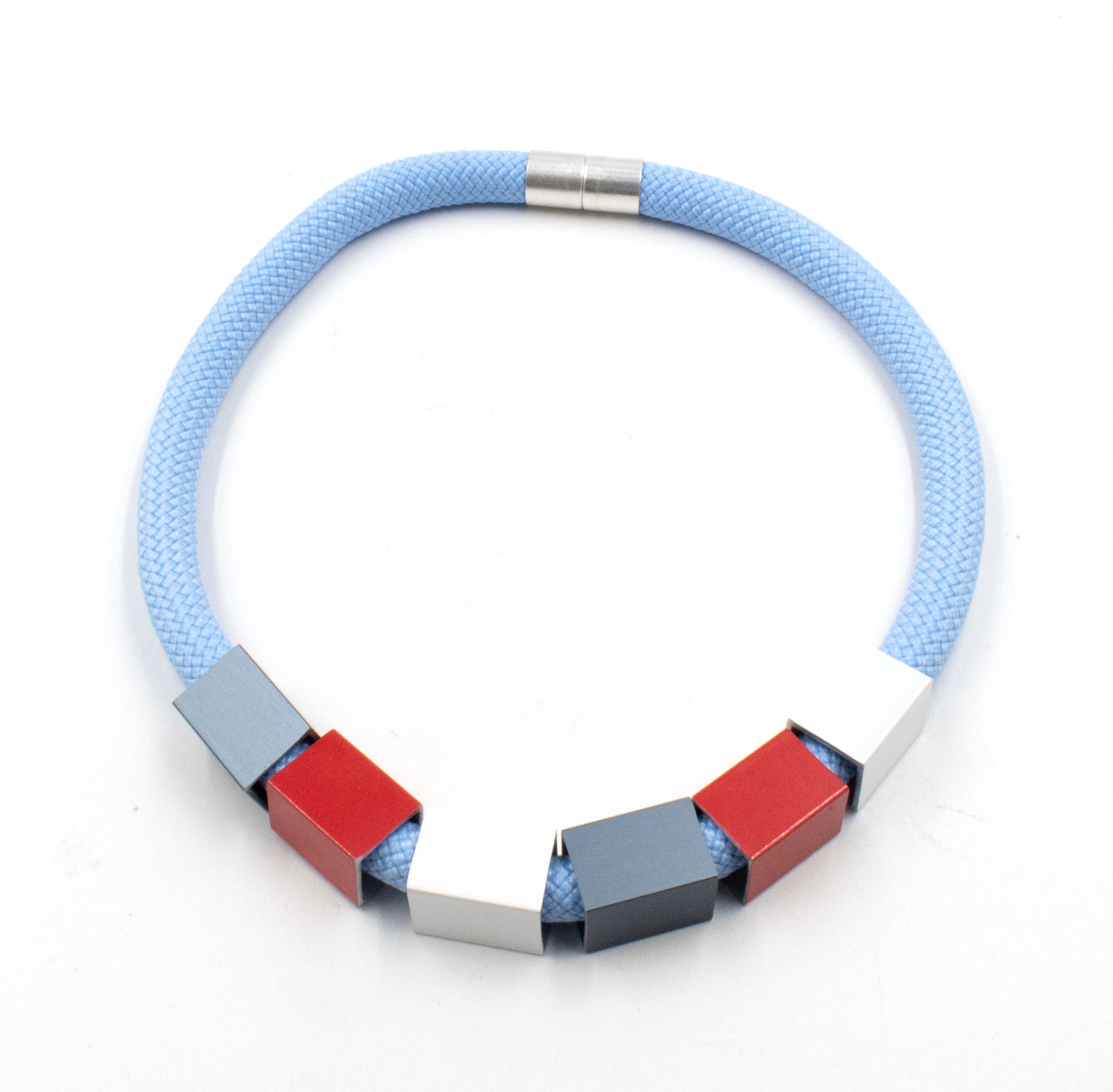 Experience the perfect blend of modern design and vibrant style with the Beyond Simplicity geometric aluminium cubes necklace. This striking necklace showcases a double strand of thick cotton rope, providing both comfort and durability. Adorned with staggered aluminium cubes in a variety of eye-catching color combinations, it adds a dynamic and artistic touch to any outfit.