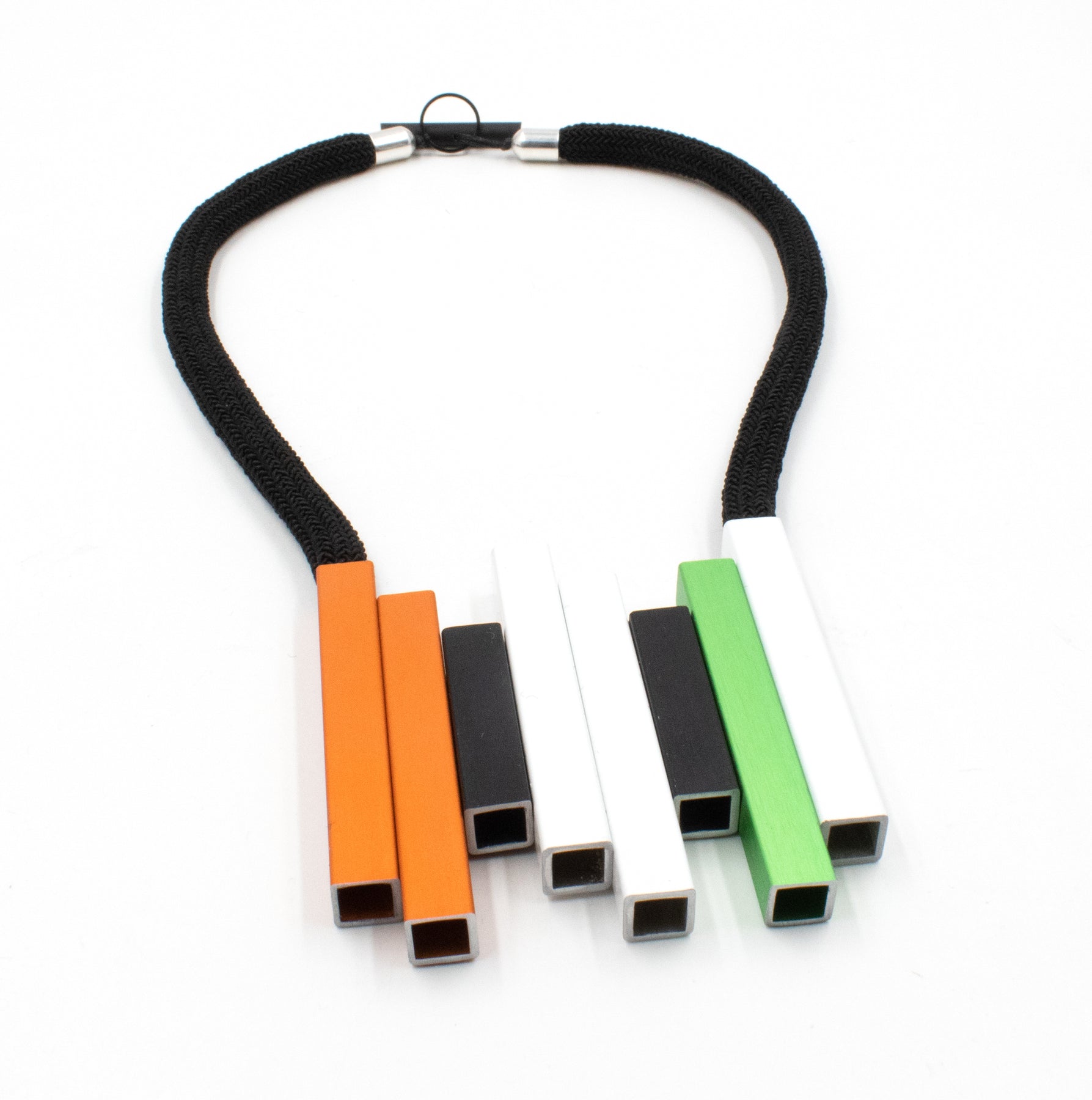 Elevate your accessory game with our anodized aluminium cord necklace. Featuring premium cords available in a variety of vibrant colors, this necklace is paired with anodized aluminium tubes in striking color combinations that bring a playful yet sophisticated touch to any outfit.