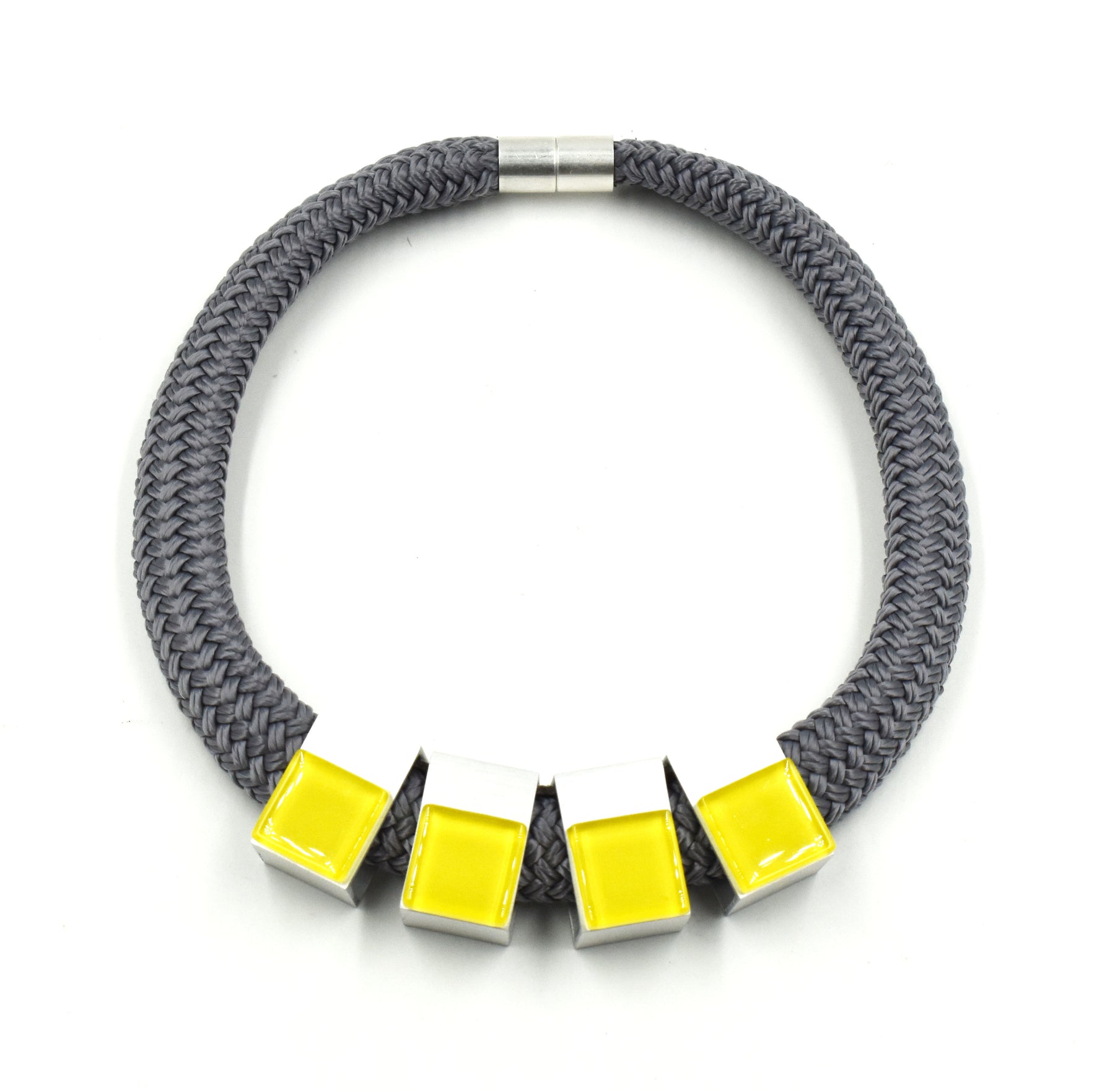 Experience the perfect blend of modern design and vibrant style with the Beyond Simplicity geometric aluminium cubes necklace. This striking necklace showcases a double strand of thick cotton rope, providing both comfort and durability. Adorned with staggered aluminium cubes in a variety of eye-catching color combinations, it adds a dynamic and artistic touch to any outfit.
