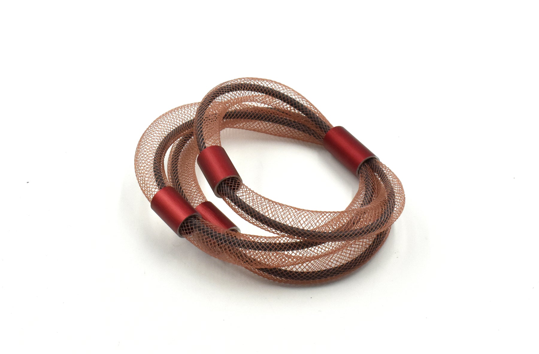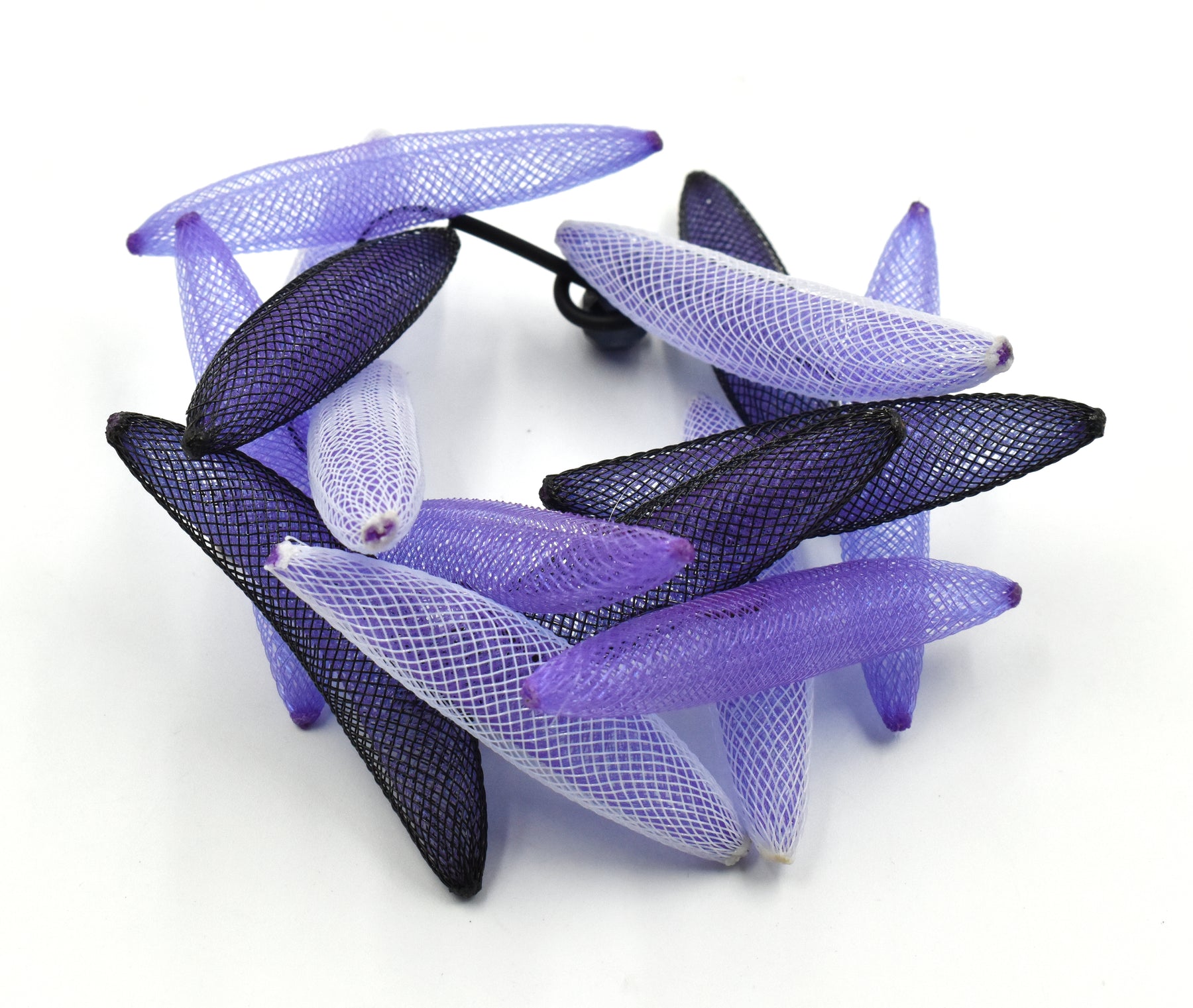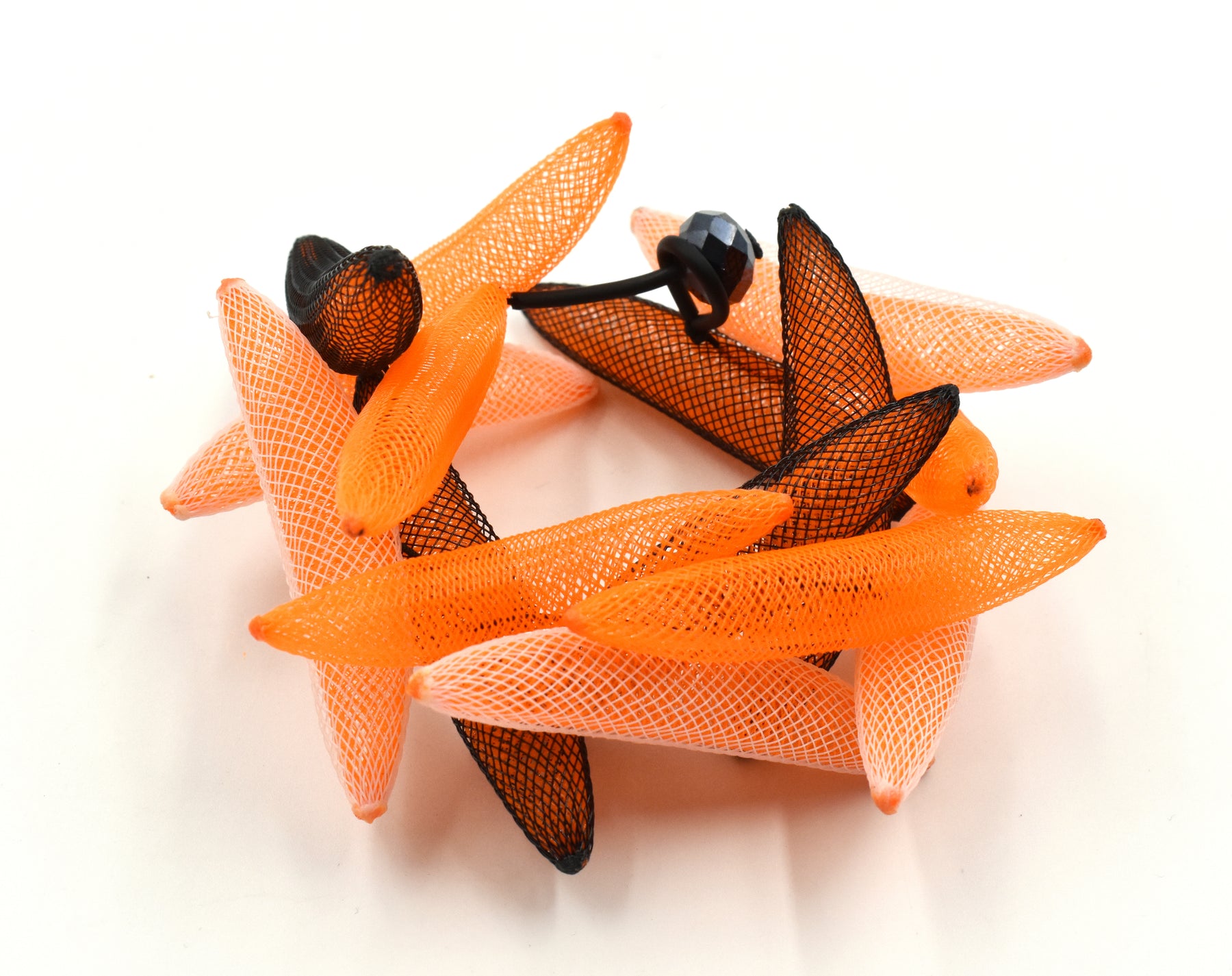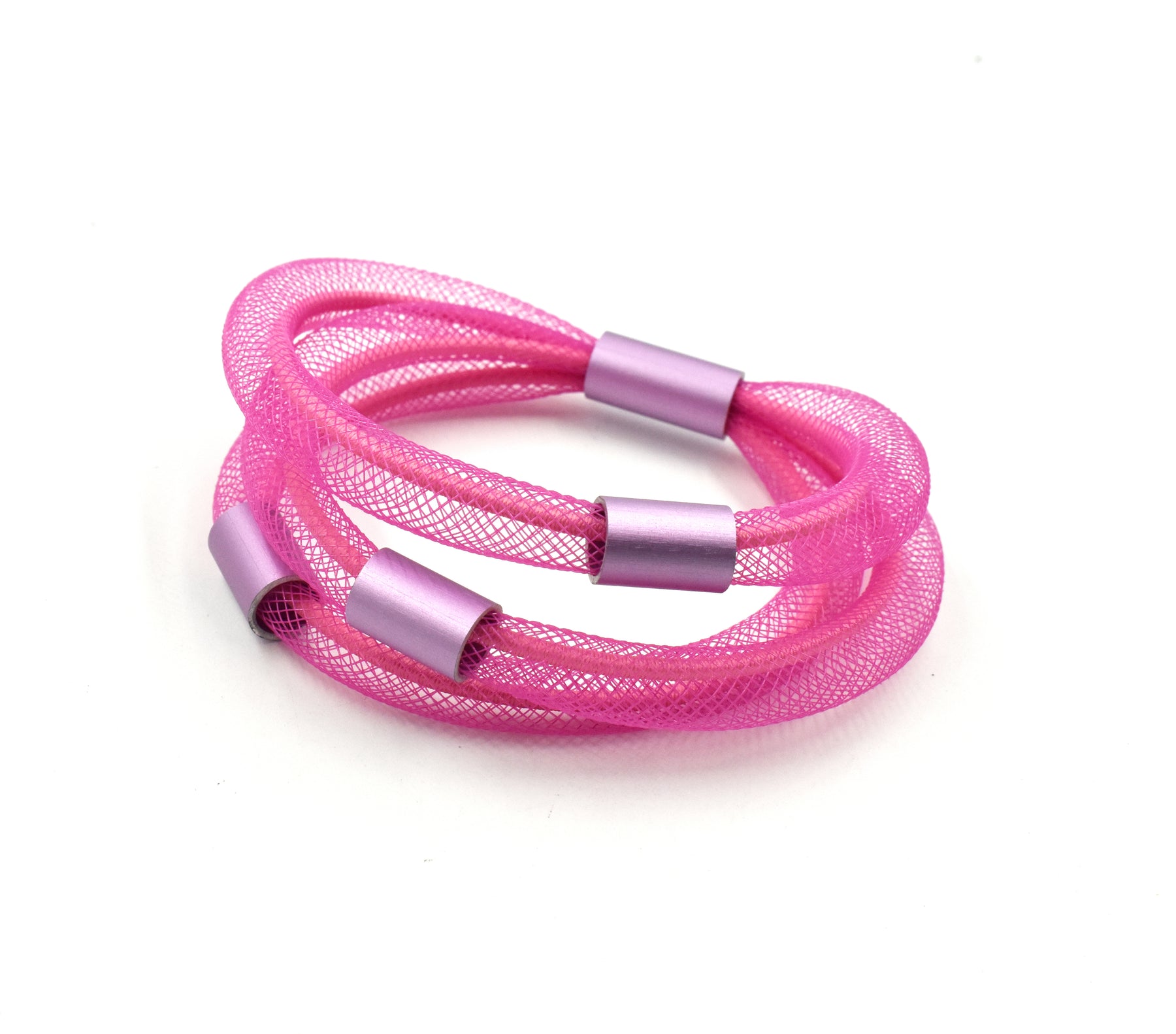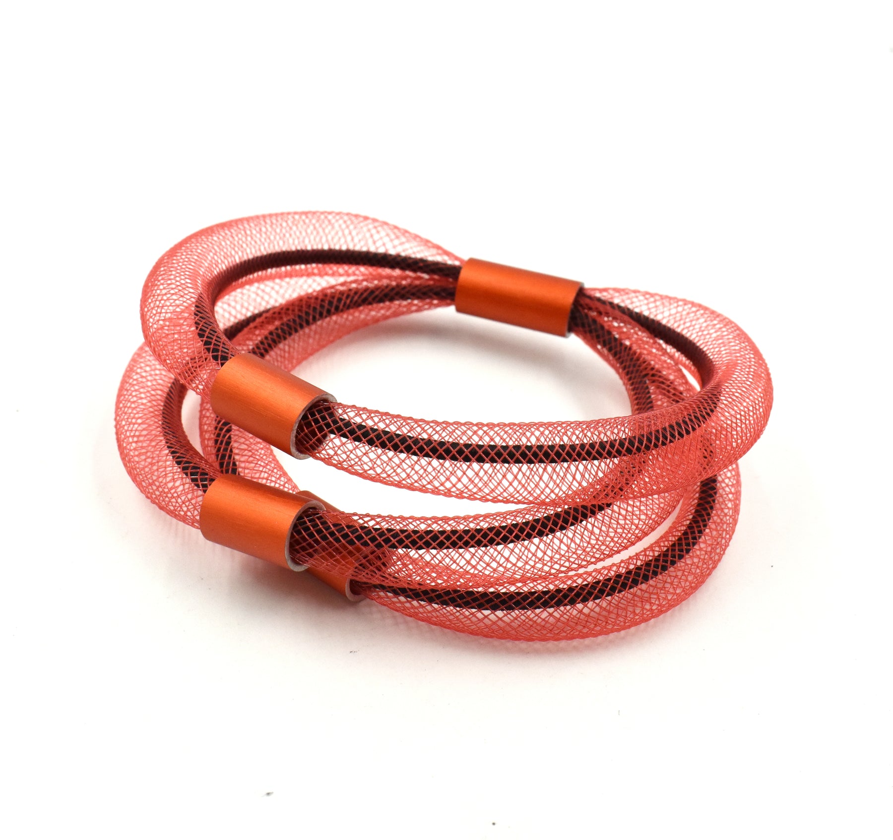 This bracelet is a striking example of contemporary jewelry design, combining lightness with sculptural presence. Crafted from fine mesh material, it creates a voluminous yet airy form that feels bold while remaining comfortable to wear. The semi-transparent texture allows light to pass through, giving the bracelet a dynamic, ever-changing appearance as it moves on the wrist.
