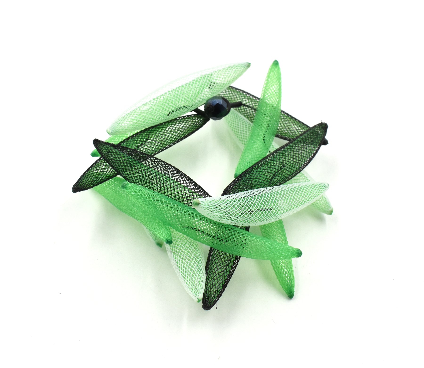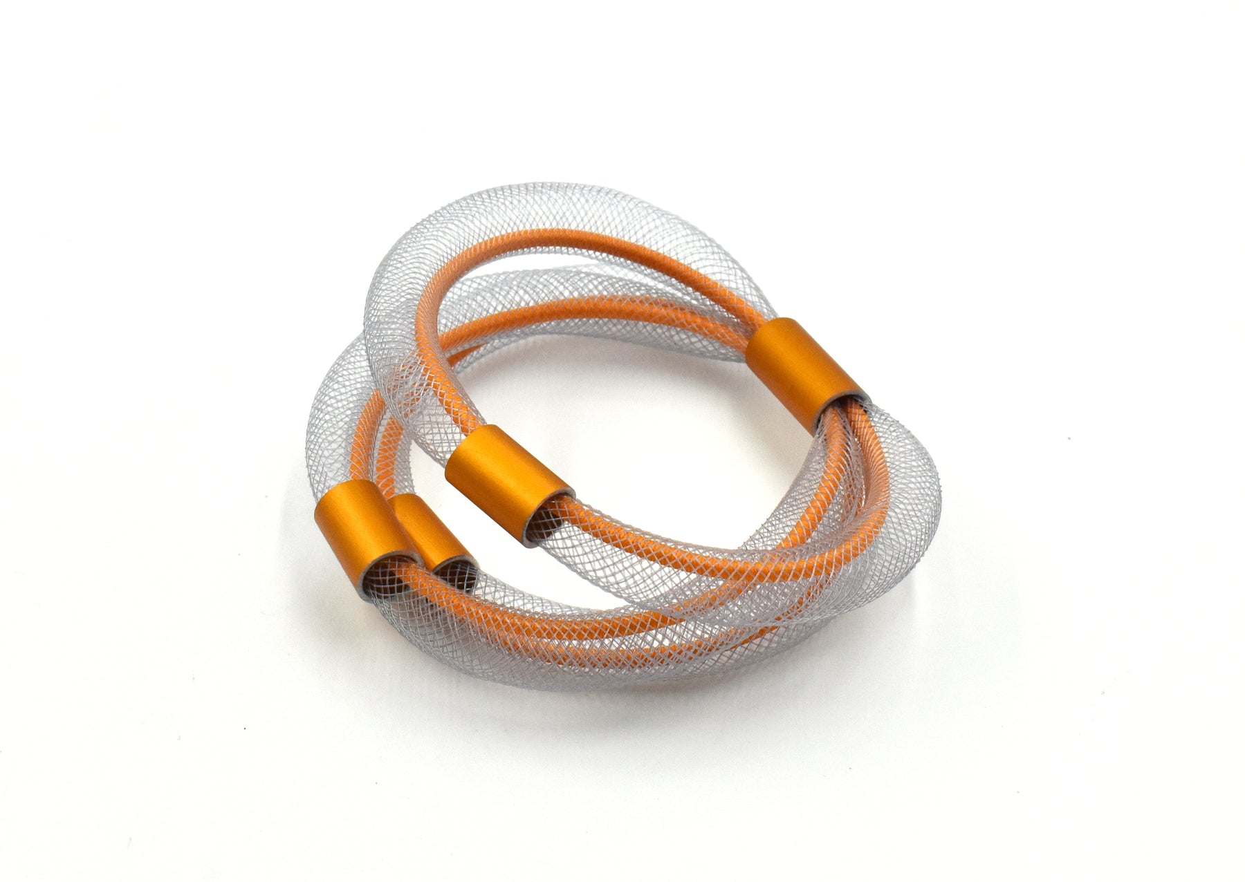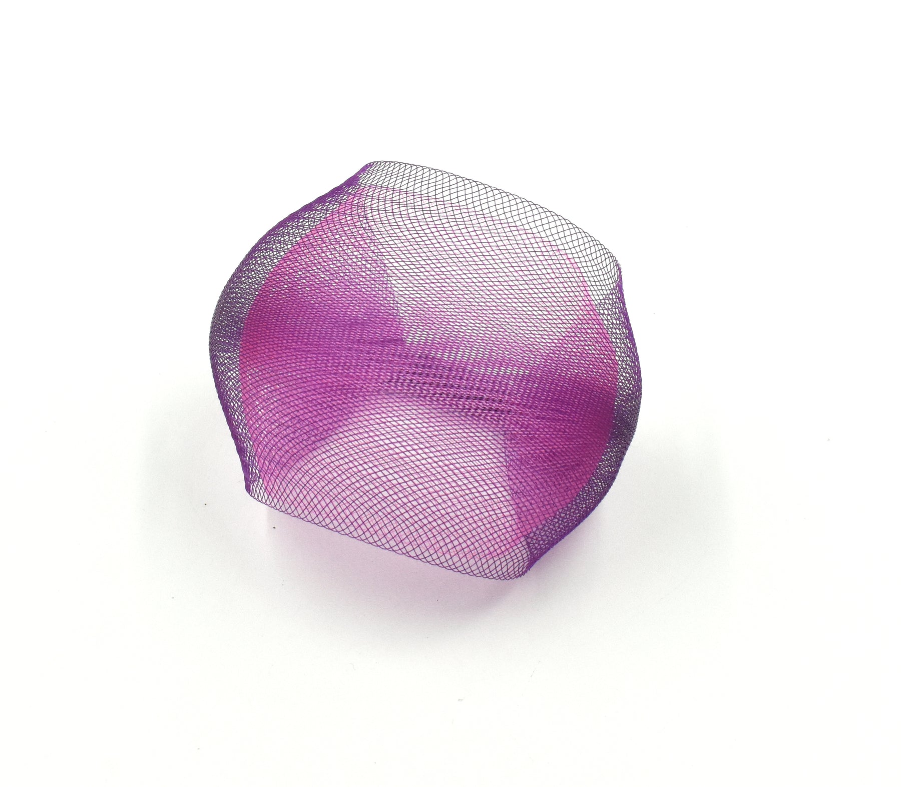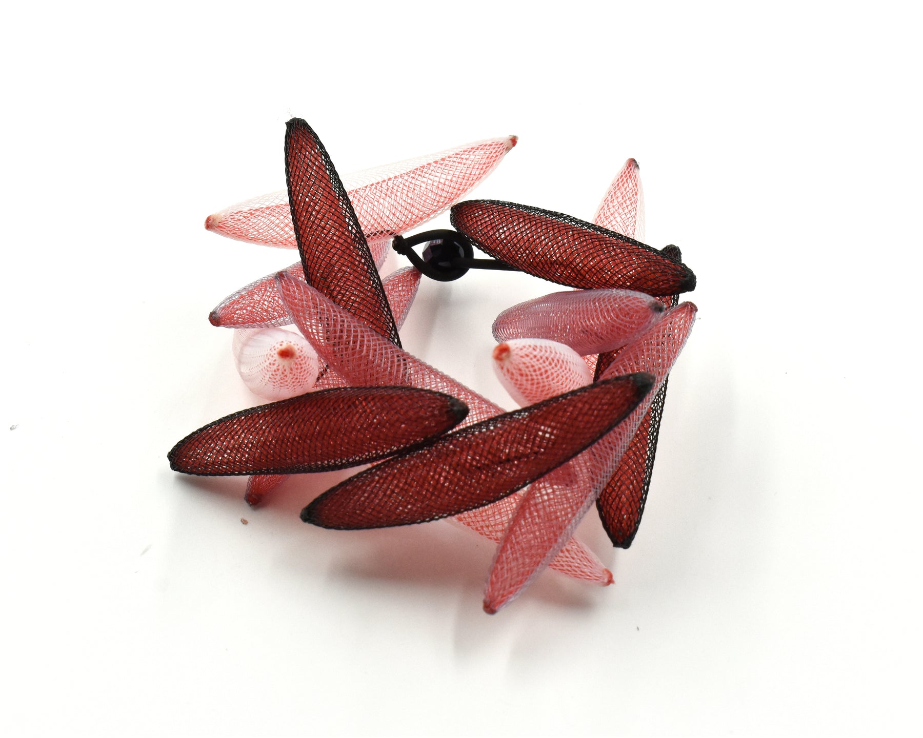 This bracelet is a striking example of contemporary jewelry design, combining lightness with sculptural presence. Crafted from fine mesh material, it creates a voluminous yet airy form that feels bold while remaining comfortable to wear. The semi-transparent texture allows light to pass through, giving the bracelet a dynamic, ever-changing appearance as it moves on the wrist.