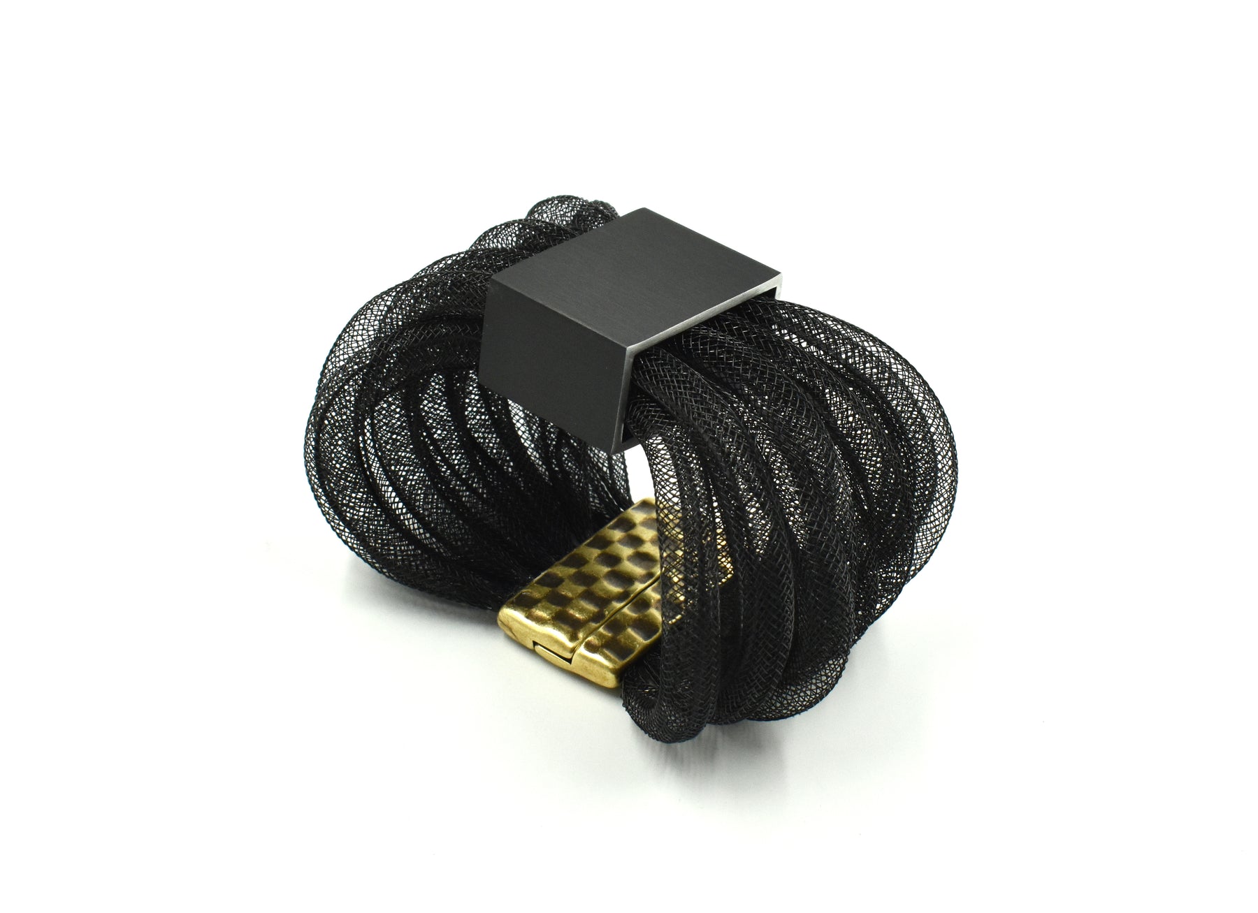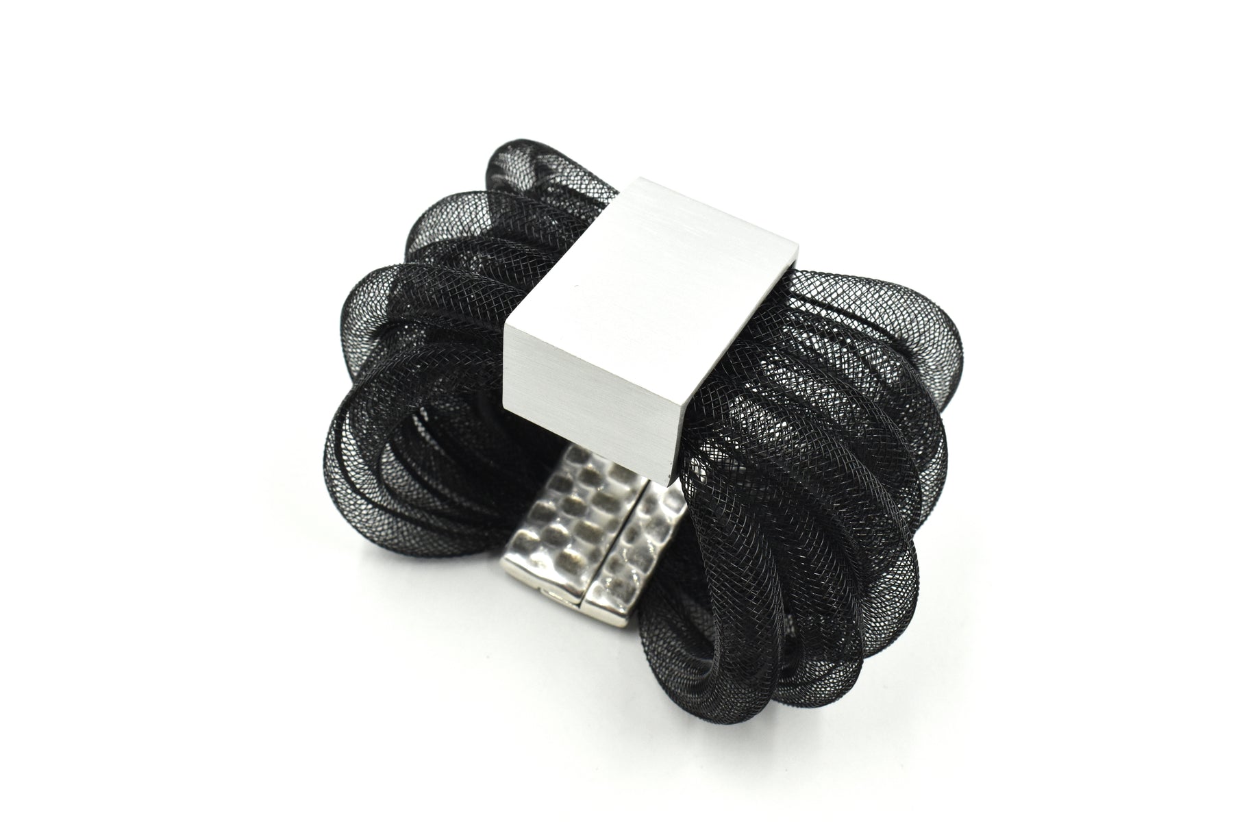 This bracelet is a striking example of contemporary jewelry design, combining lightness with sculptural presence. Crafted from fine mesh material, it creates a voluminous yet airy form that feels bold while remaining comfortable to wear. The semi-transparent texture allows light to pass through, giving the bracelet a dynamic, ever-changing appearance as it moves on the wrist.