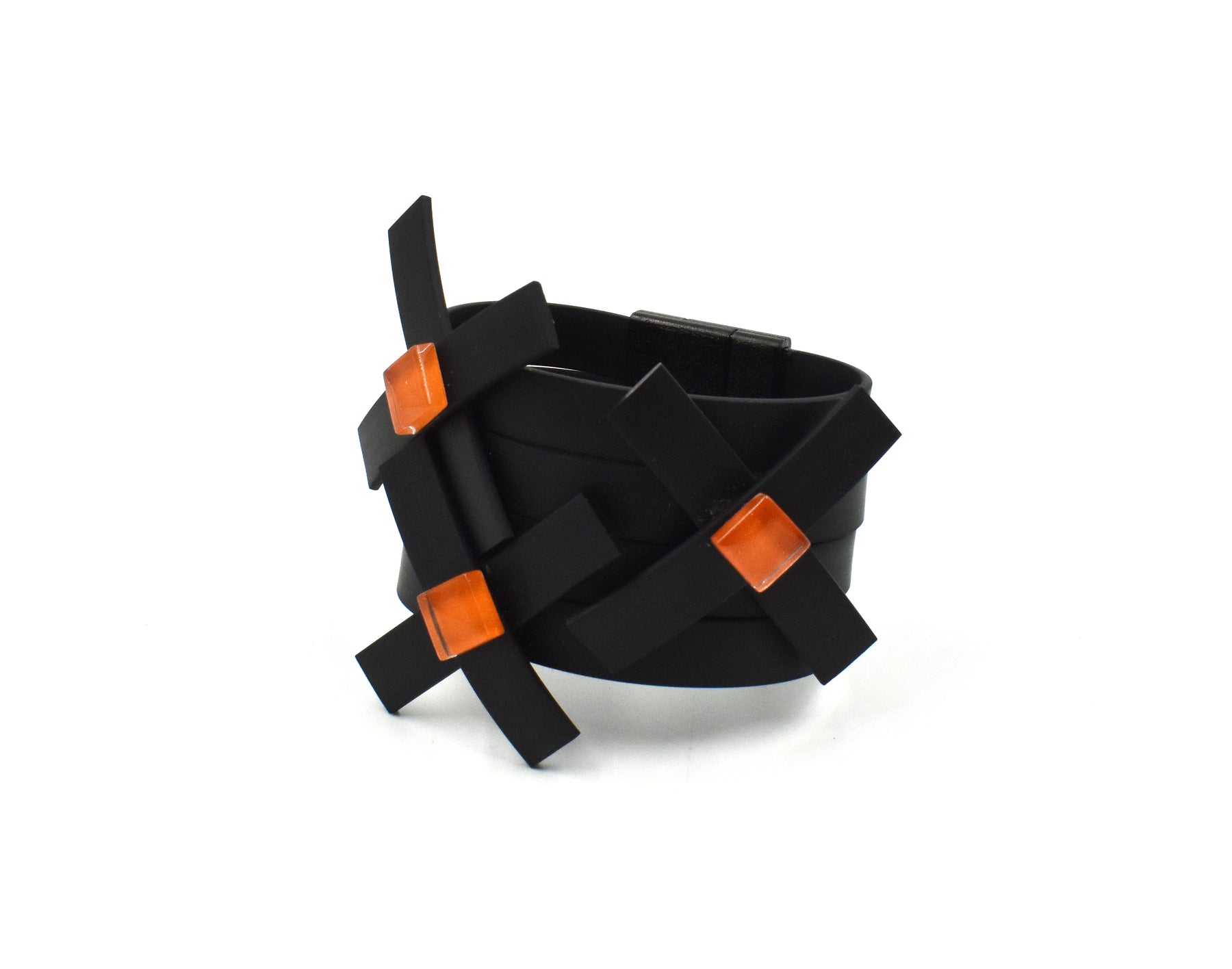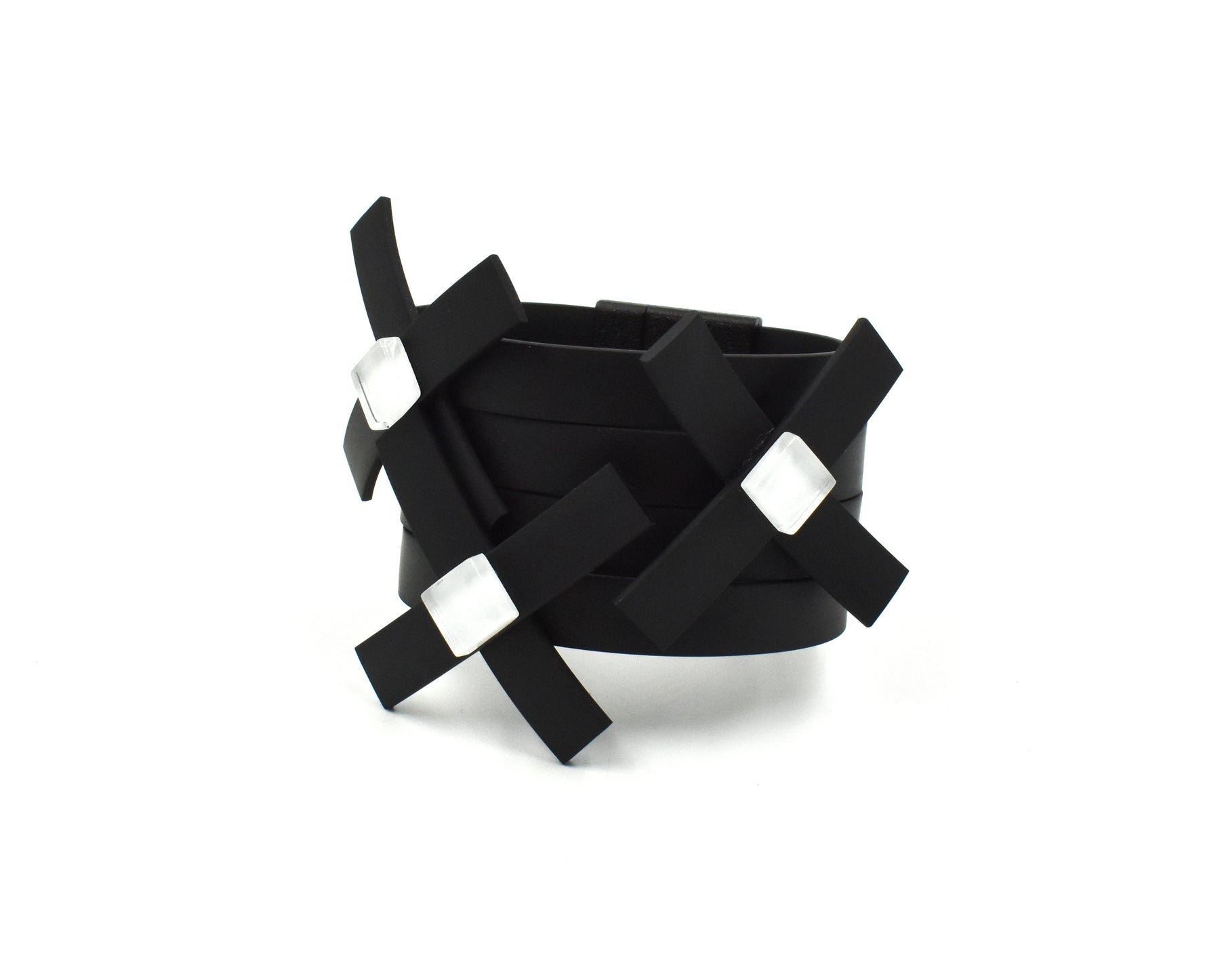 A bold fusion of modern design and artistic flair. Its sleek black rubber band creates a strong foundation, while transparent geometric elements are intricately arranged to add depth, dimension, and movement. Accented with vibrant color silk cord the piece combines structure with playfulness, resulting in a unique accessory that stands out with contemporary elegance.