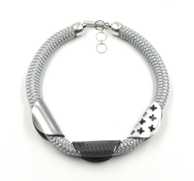 Elevate your style with this handmade contemporary necklace, a striking statement piece that blends modern design with timeless elegance. Crafted with sleek black lines of rubber that gracefully curve, each strand is accented with a polished sphere, creating a unique balance of geometry and movement.