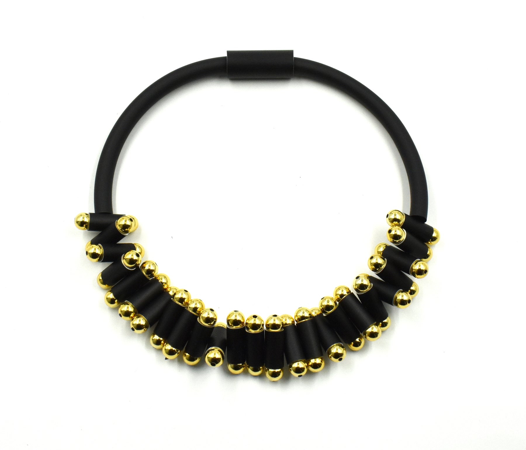 Discover the Urban Abstractnecklace, a playful fusion of modern design and edgy style. This geometric necklace features sleek tube squares crafted from durable anodized aluminum, complemented by textured elements and flexible rubber accents.