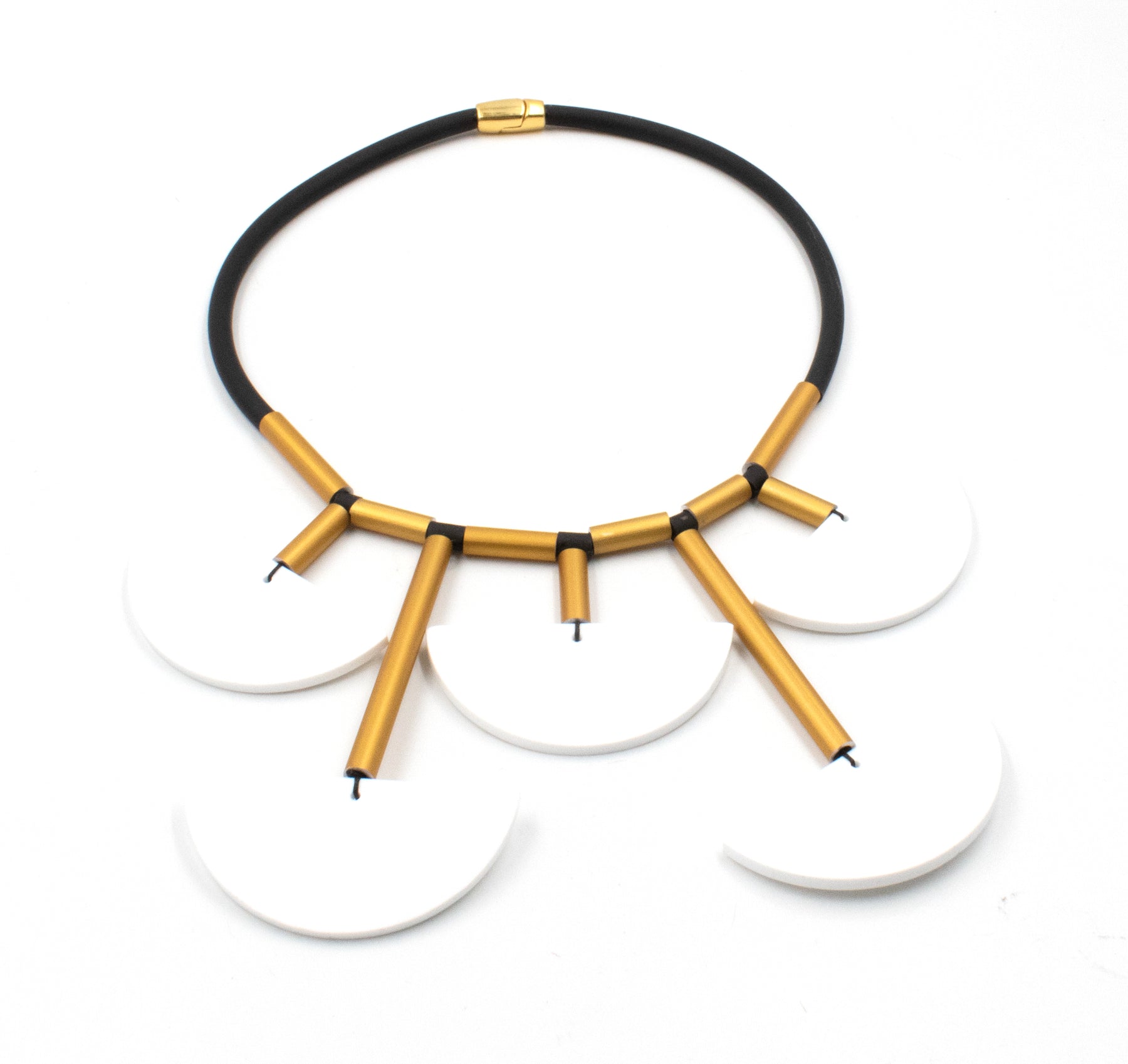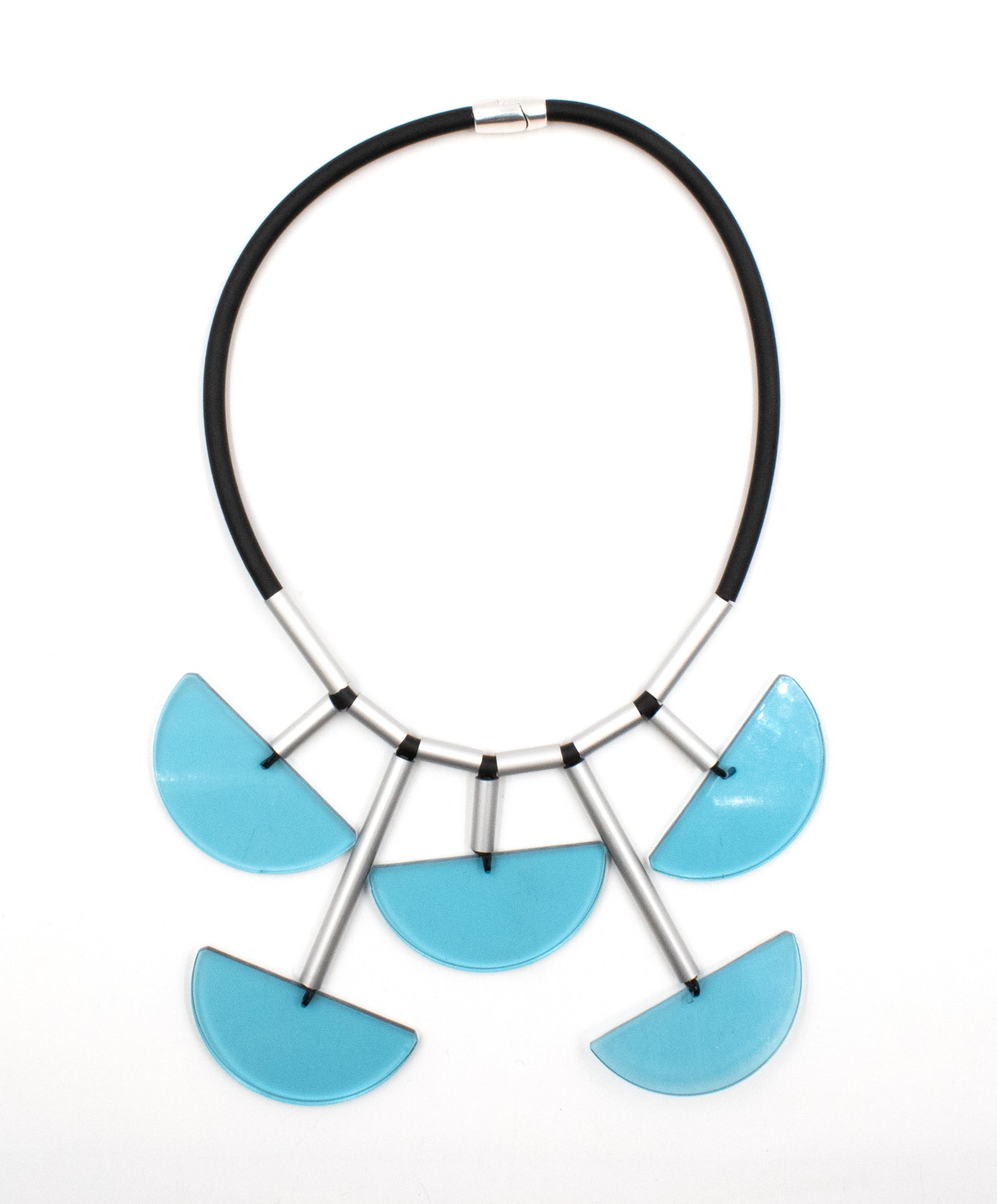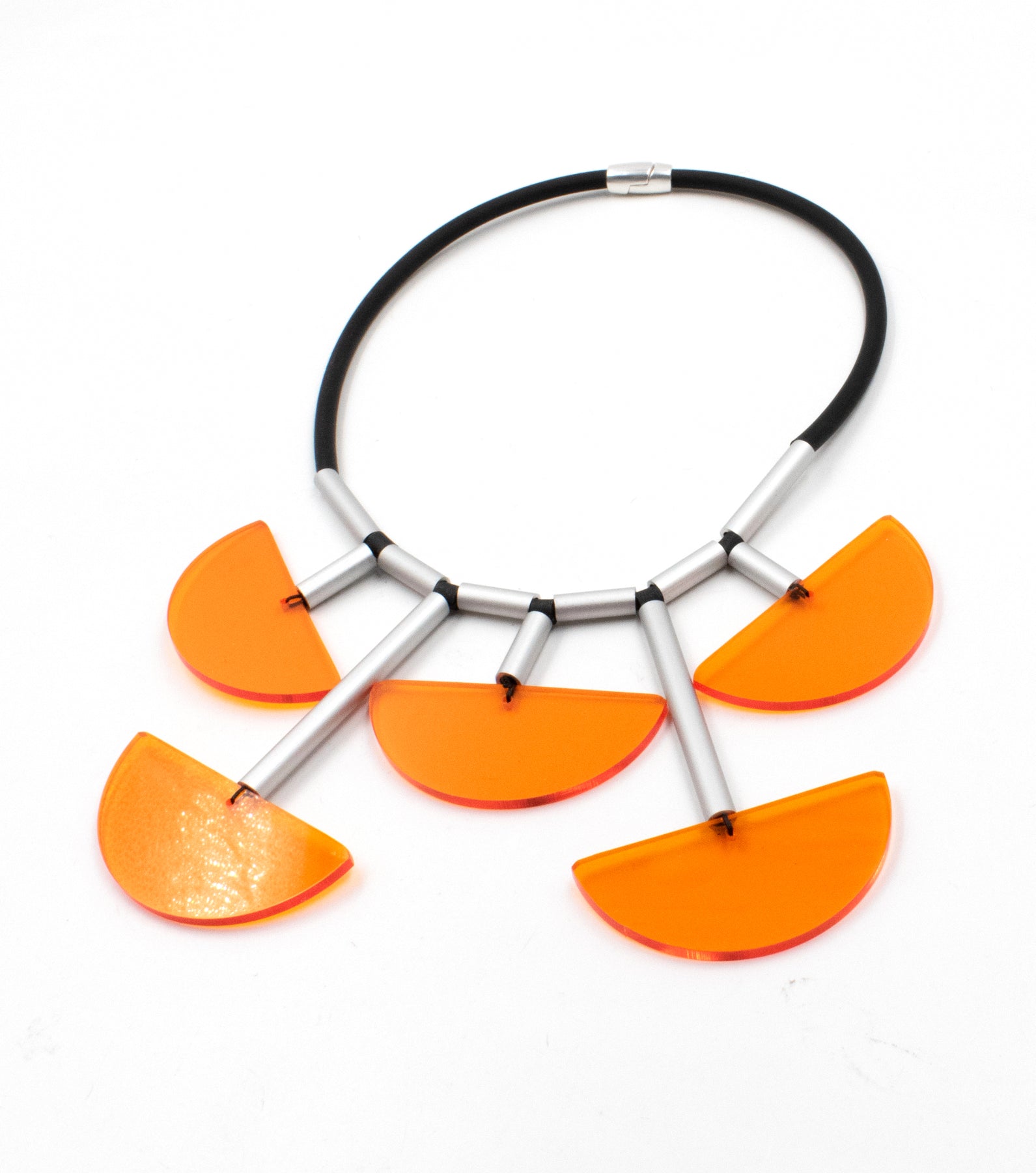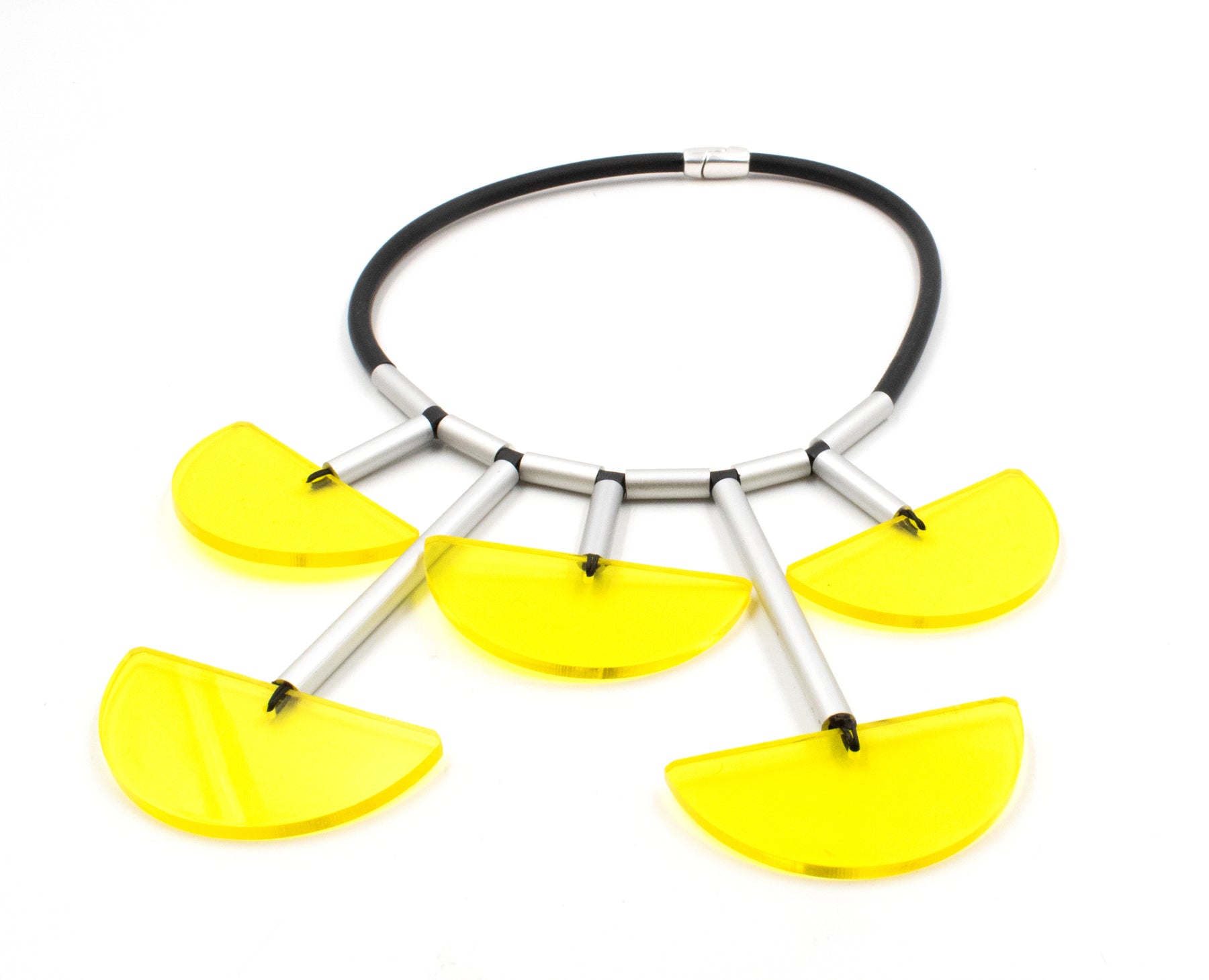 Elevate your look with the Raise the Vibration necklace, a vibrant celebration of color and form. Featuring multicolored half-circle plexiglass pieces paired with sleek aluminum elements on the sides, this necklace creates a playful harmony between bold design and modern flair.
