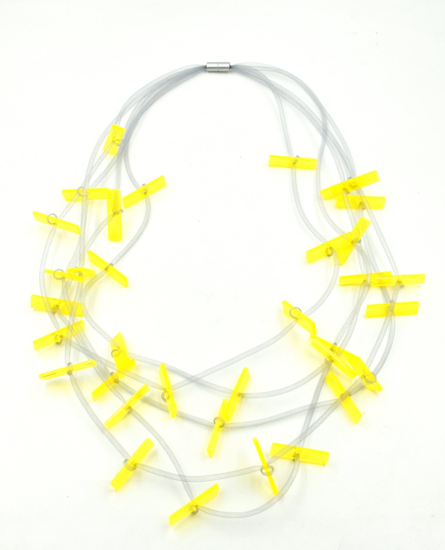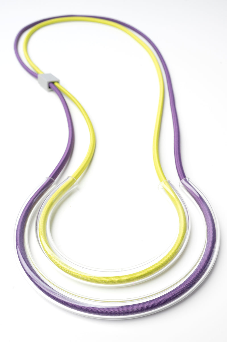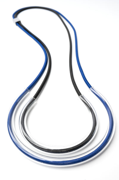 Elevate your style with this playful and unique handmade plexiglass necklace, featuring vibrant multi-colored elastic cords encased in a transparent tube. Each piece showcases a special technique that artfully covers the elastic cords with clear plexiglass, creating a fascinating mix of color and shine.