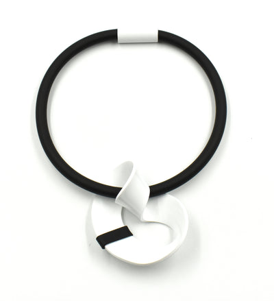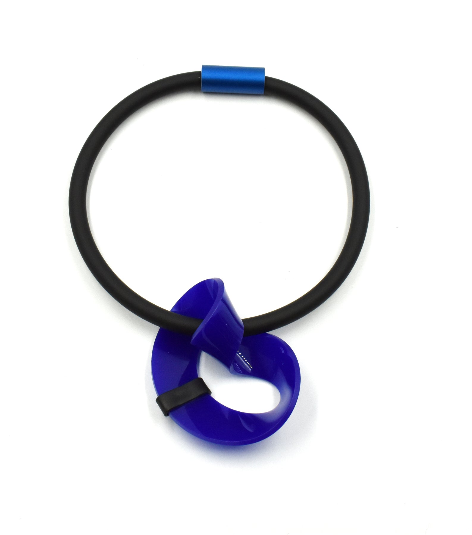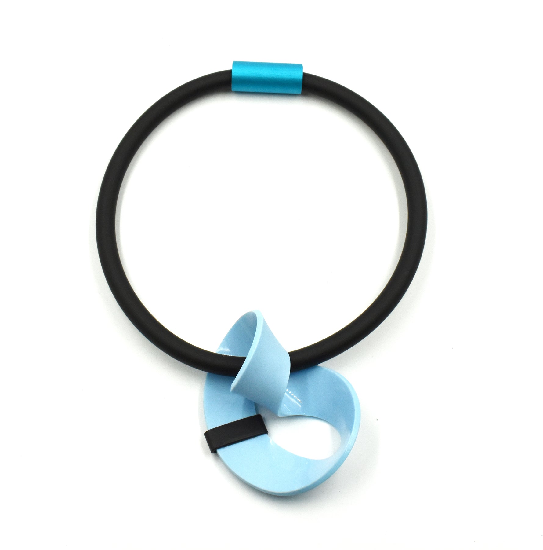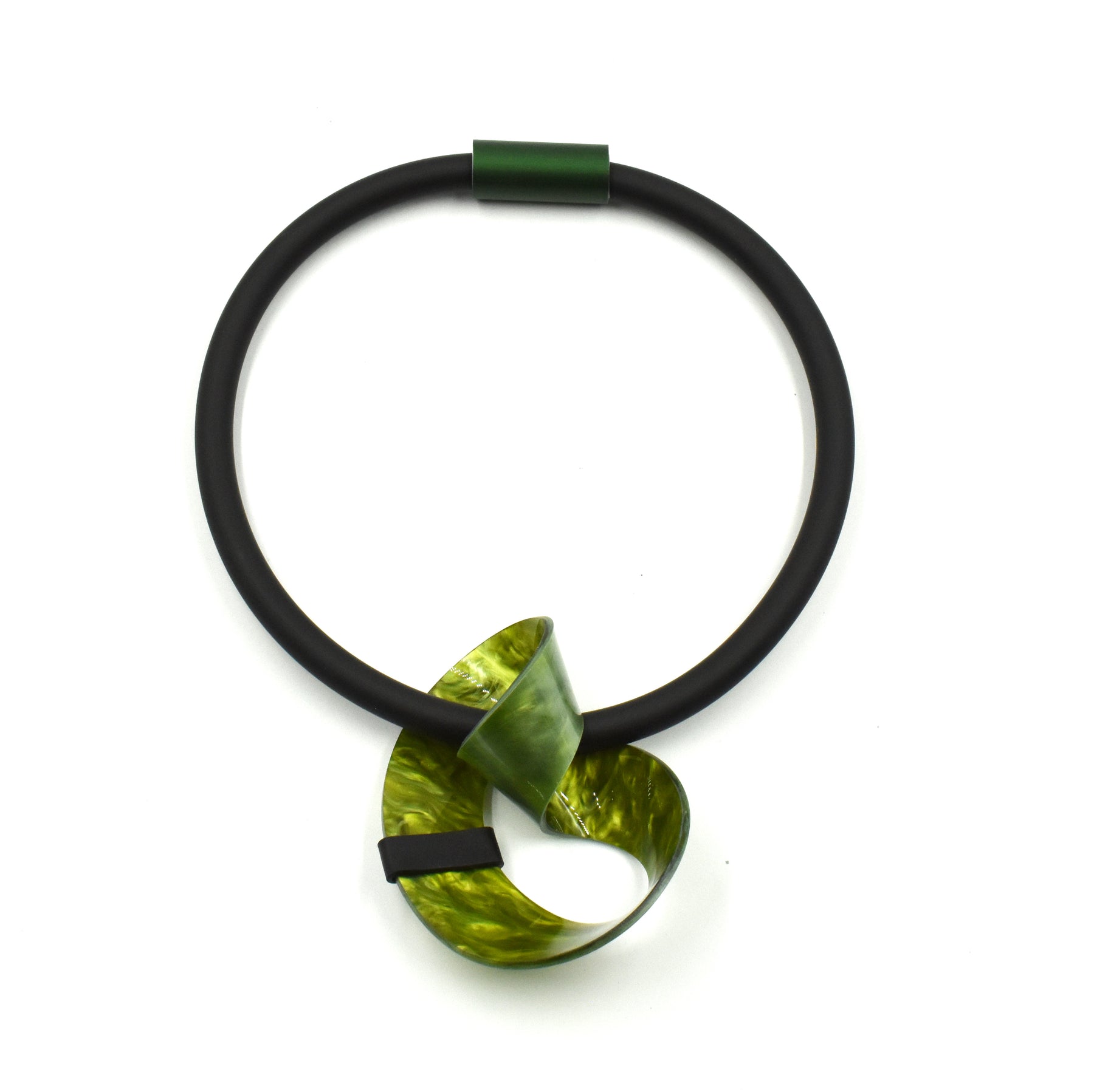 A striking piece of contemporary jewelry, this handmade necklace combines sculptural elegance with bold color. The design features a sleek black rubber band adorned with a dynamic spiral plexiglass in glossy tones.