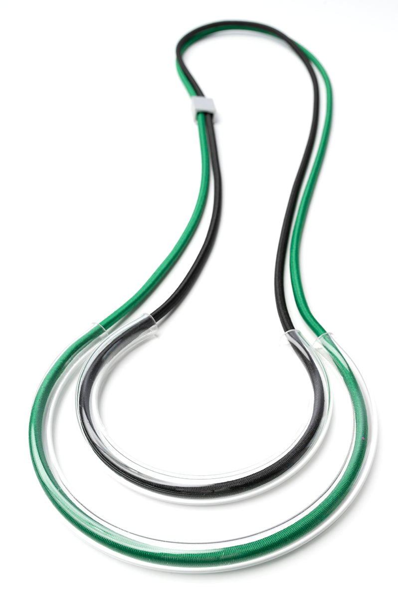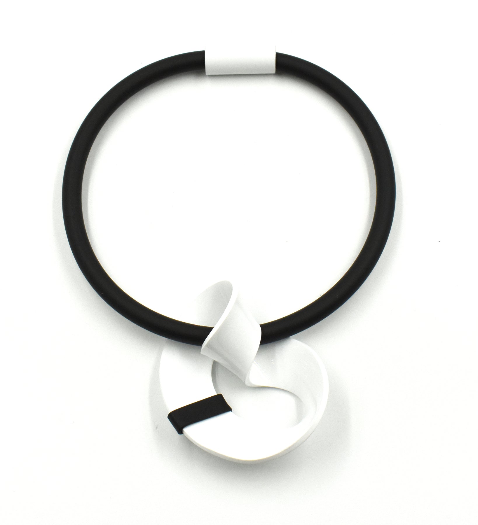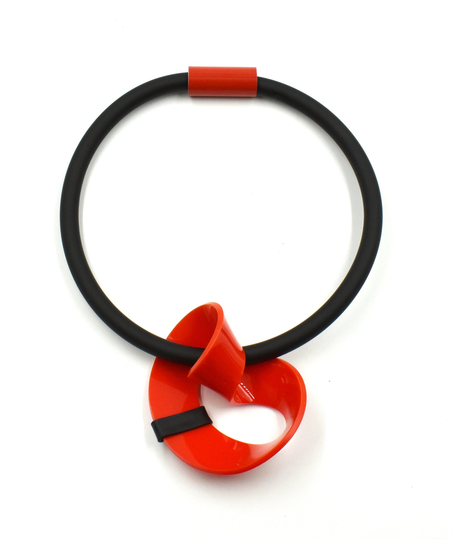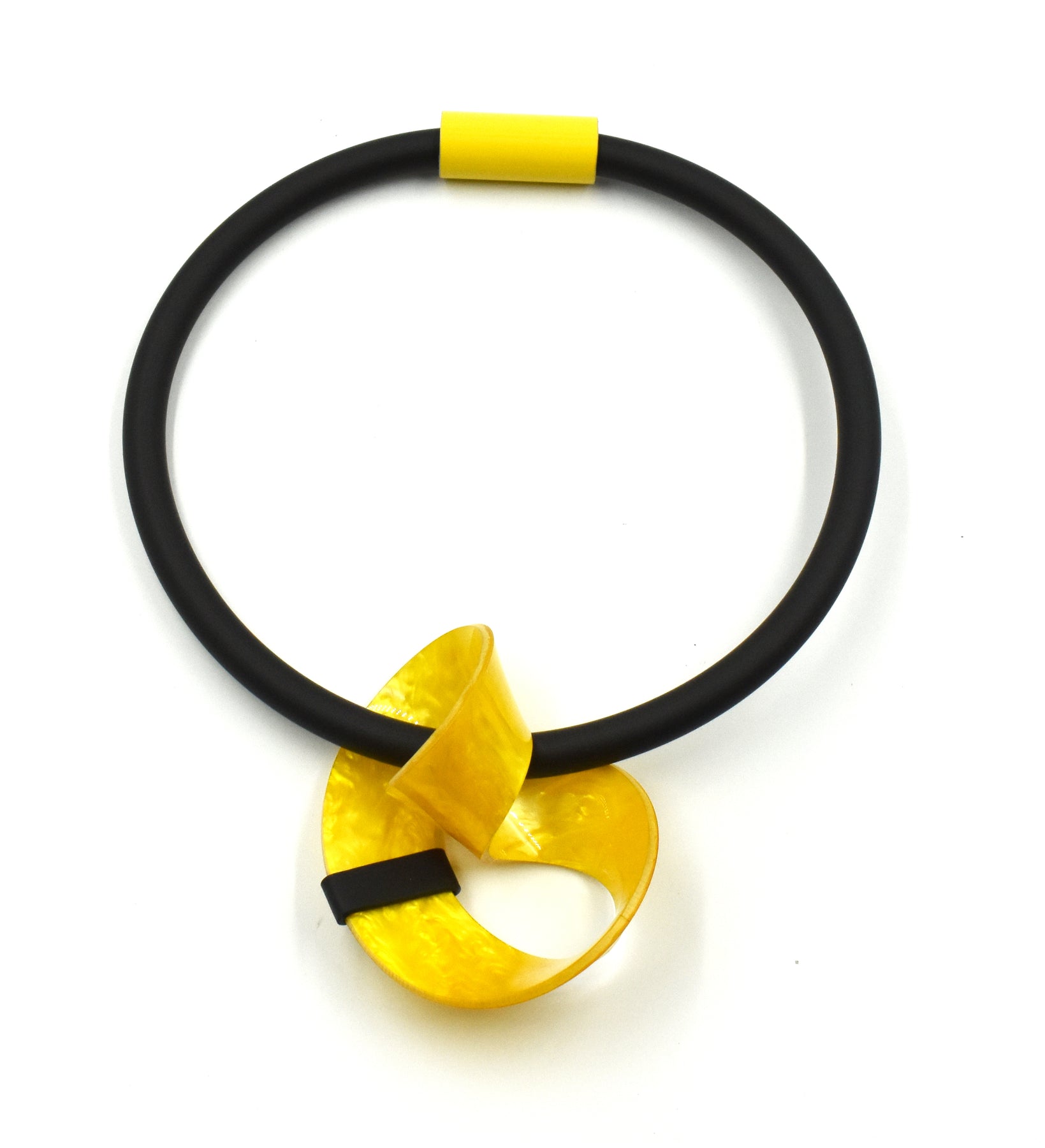 A striking piece of contemporary jewelry, this handmade necklace combines sculptural elegance with bold color. The design features a sleek black rubber band adorned with a dynamic spiral plexiglass in glossy tones.