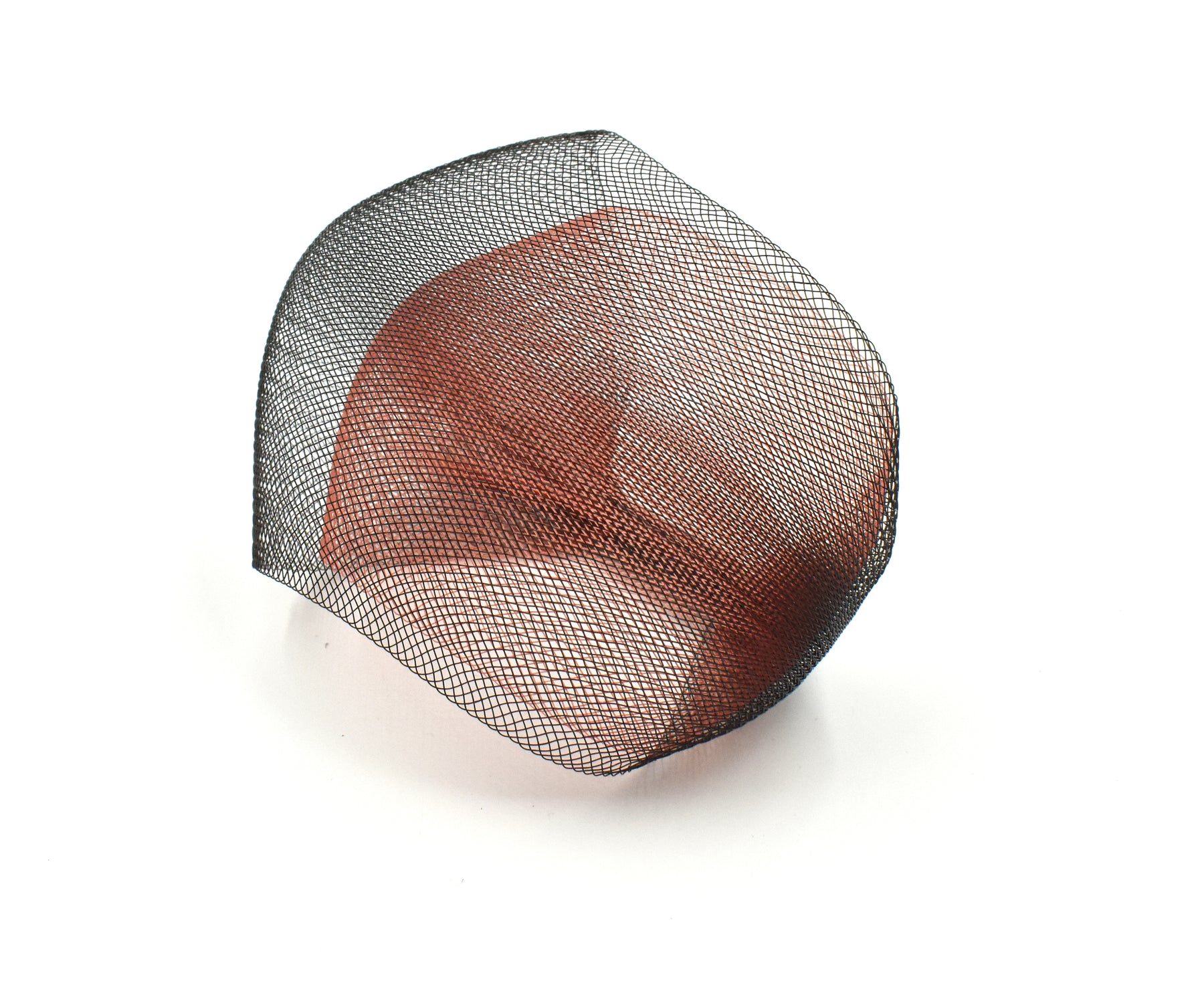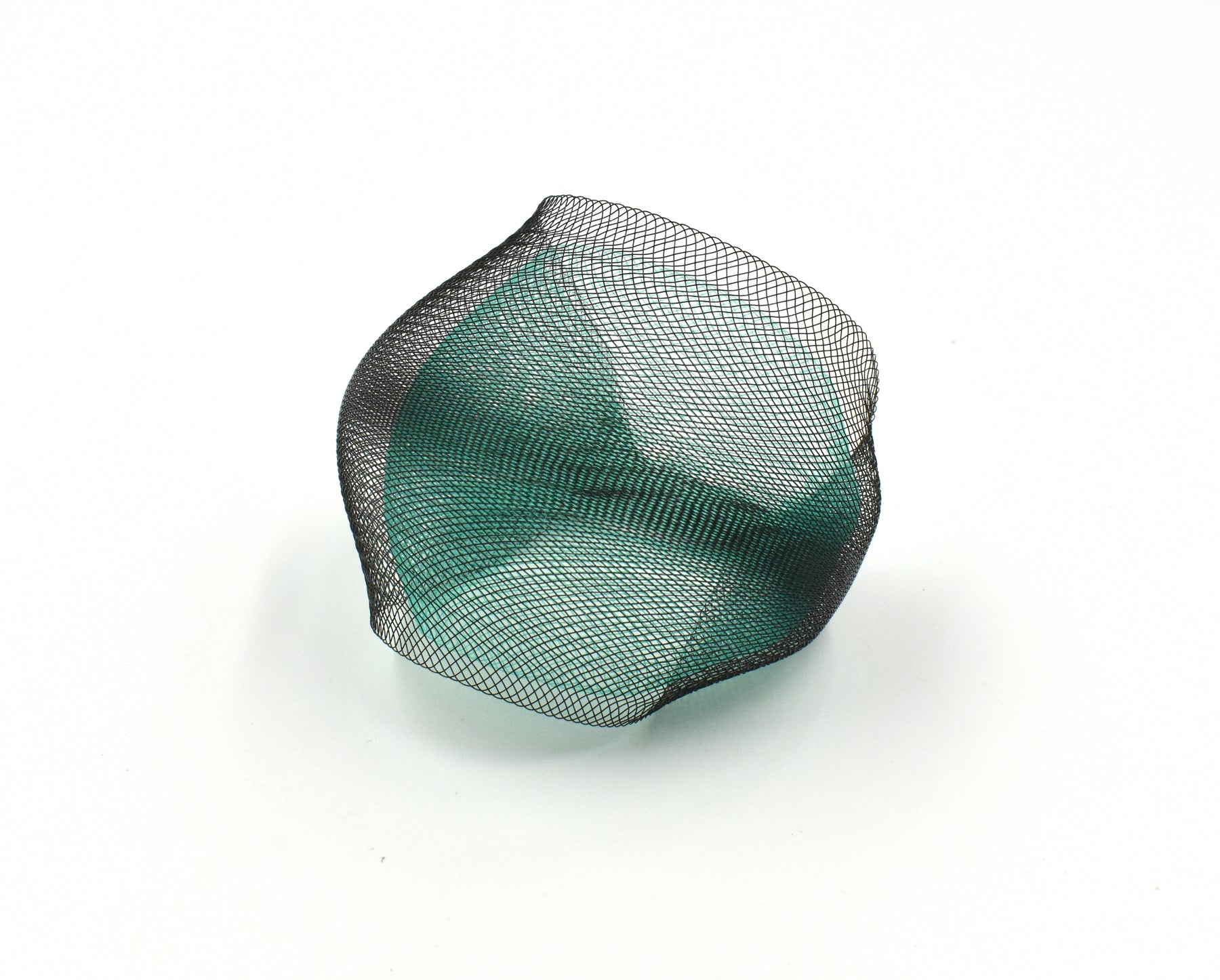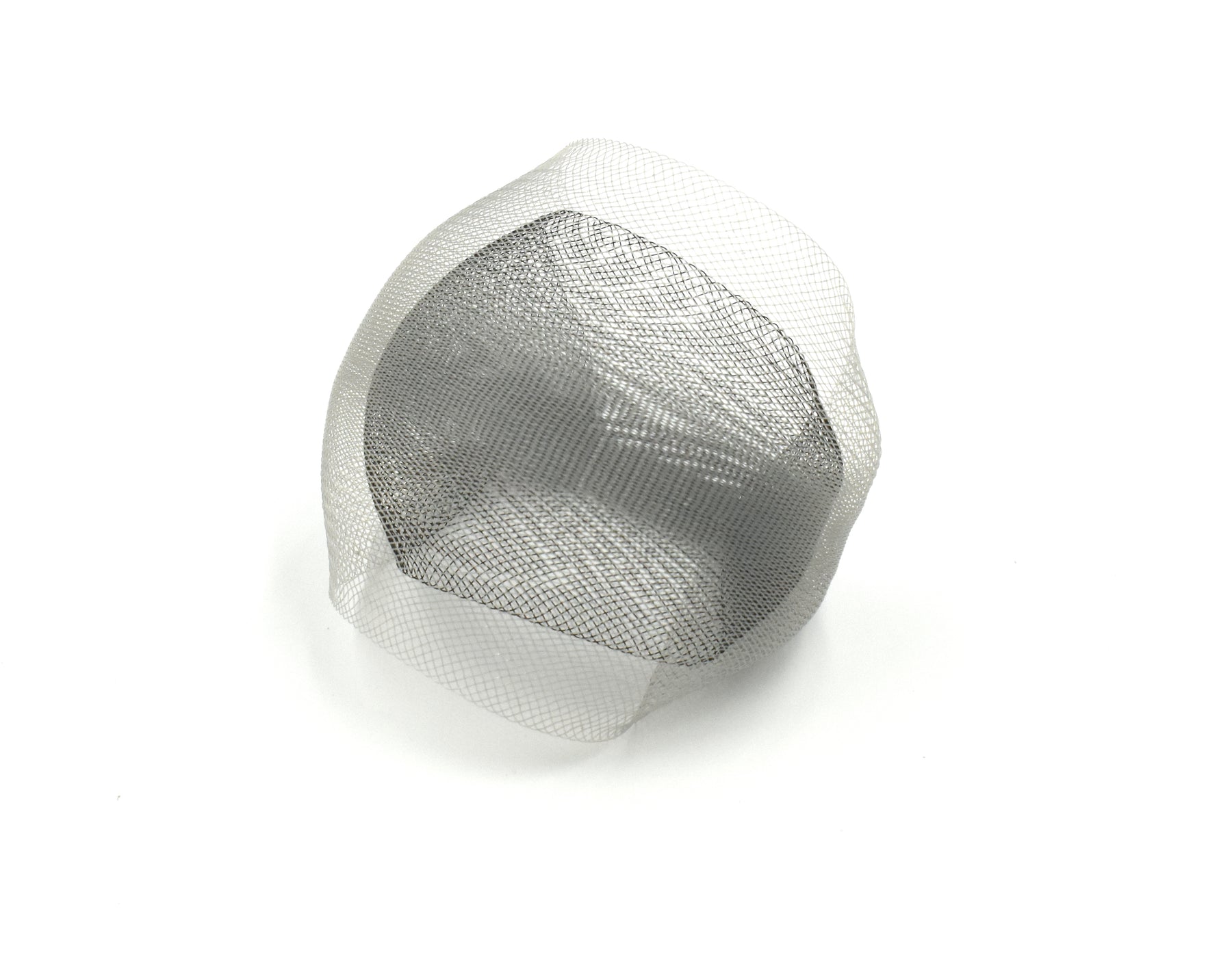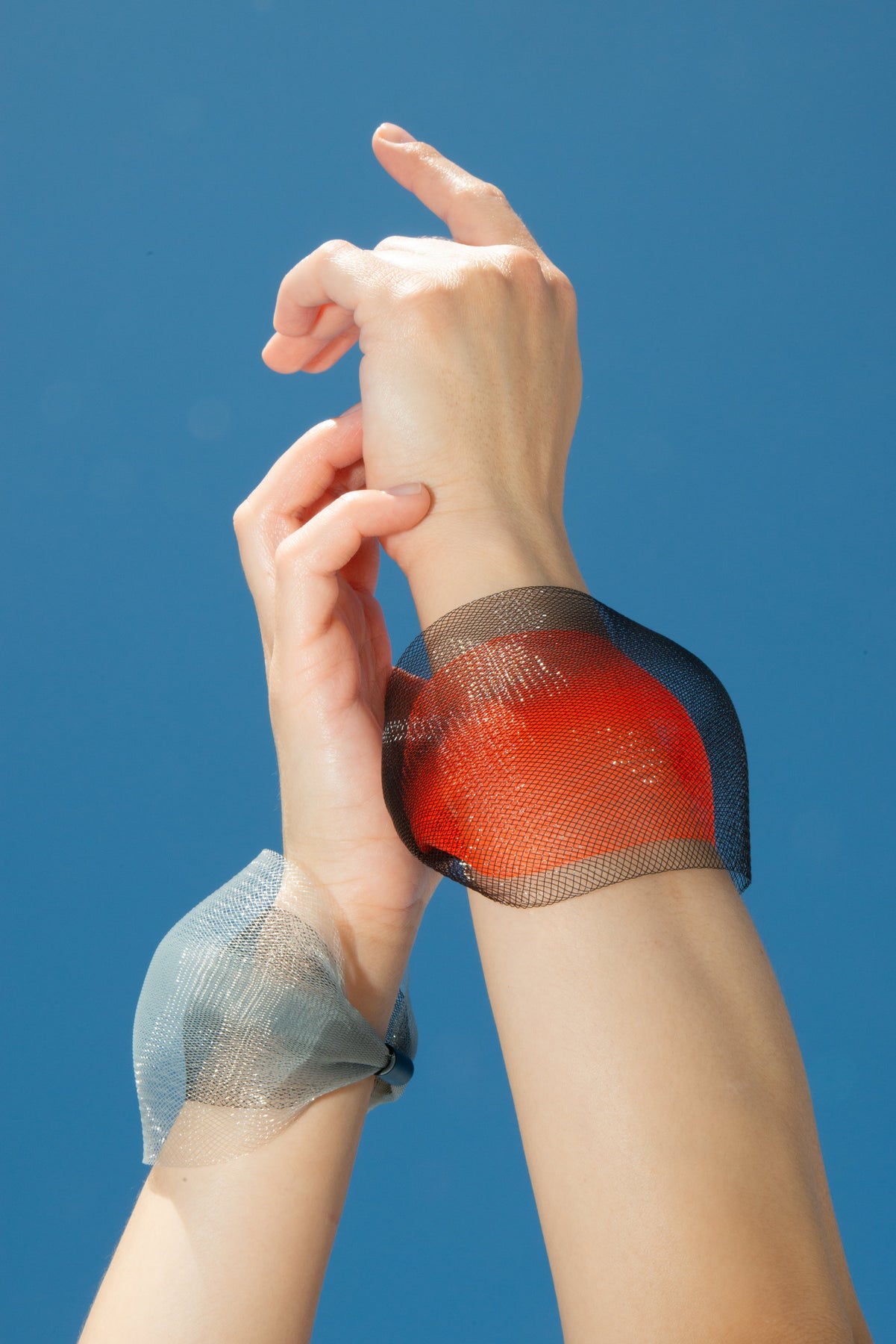 This bracelet is a striking example of contemporary jewelry design, combining lightness with sculptural presence. Crafted from fine mesh material, it creates a voluminous yet airy form that feels bold while remaining comfortable to wear. The semi-transparent texture allows light to pass through, giving the bracelet a dynamic, ever-changing appearance as it moves on the wrist.