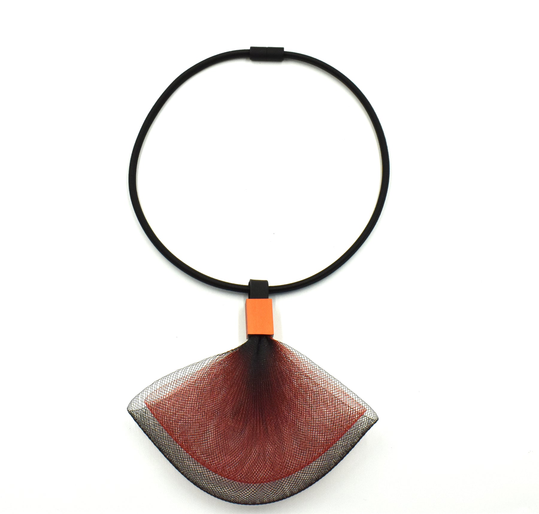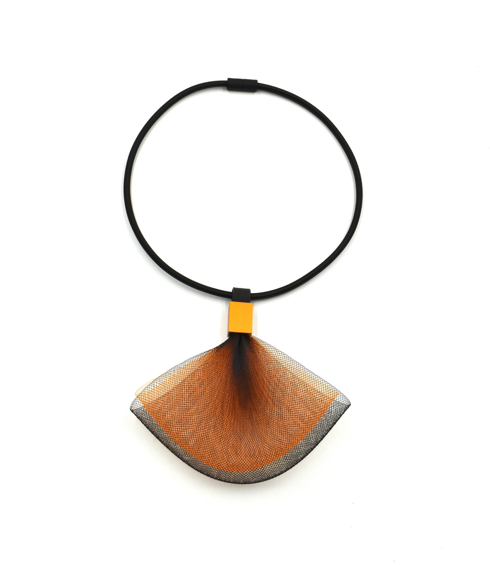 A bold and sophisticated handmade necklace that combines contemporary artistry with lightweight elegance. Designed with fluid black mesh that forms an organic silhouette, it is accented by vibrant inner lines in diferent tones held together with sleek metallic details.