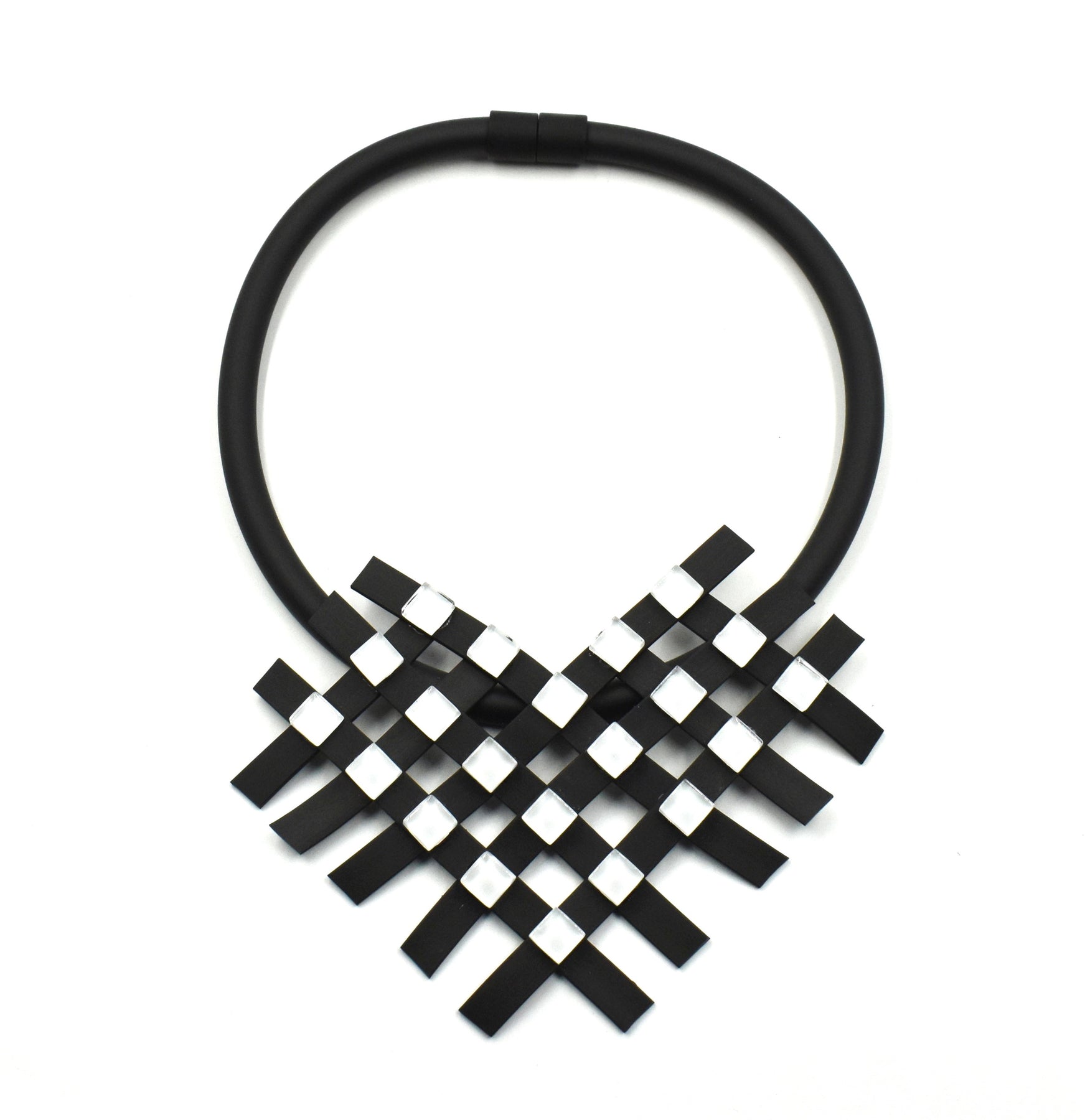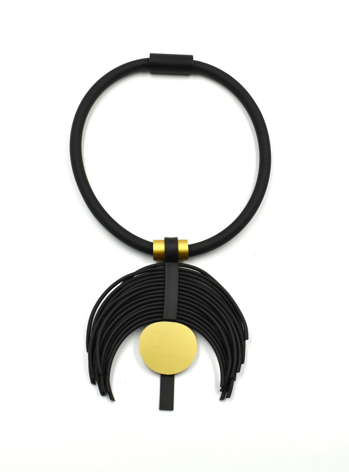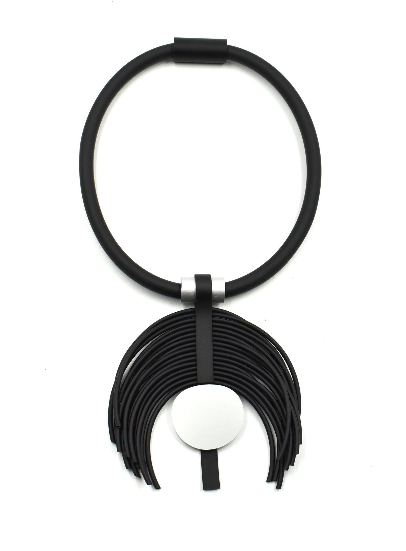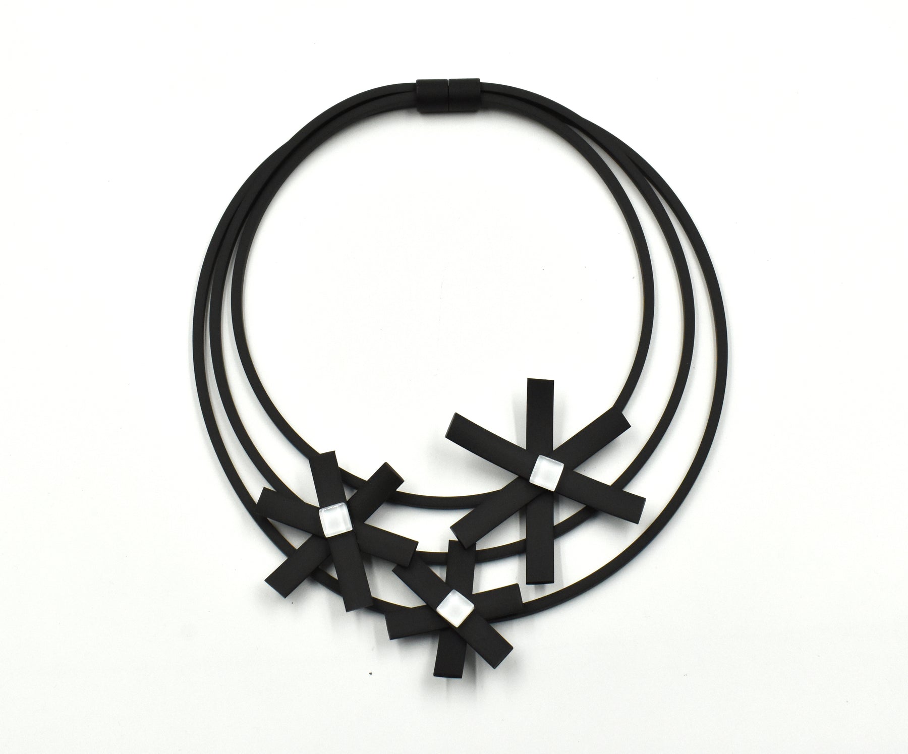 Elevate your style with this handmade contemporary necklace, a striking statement piece that blends modern design with timeless elegance. Crafted with sleek black lines of rubber that gracefully curve, each strand is accented with a polished sphere, creating a unique balance of geometry and movement.