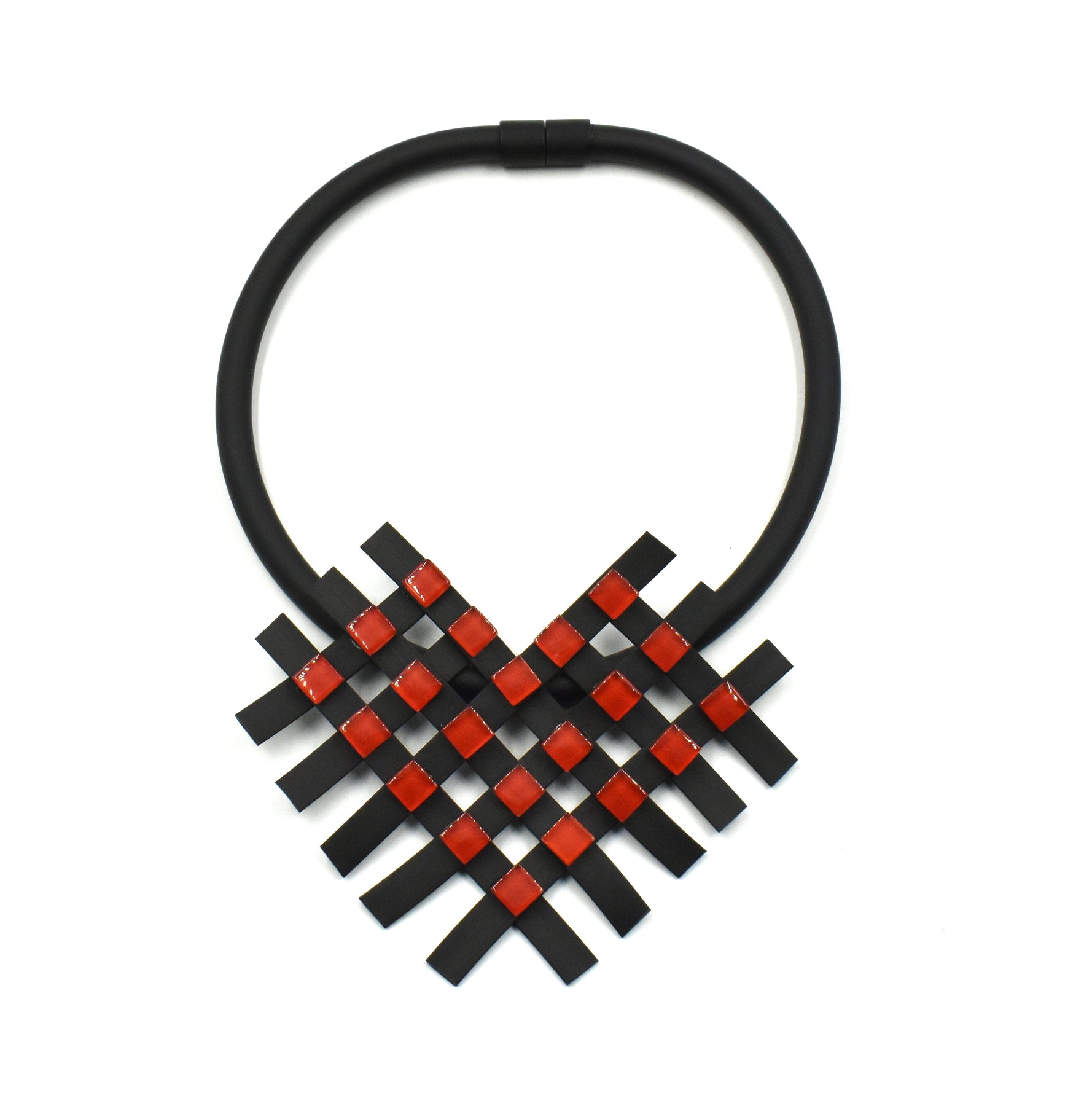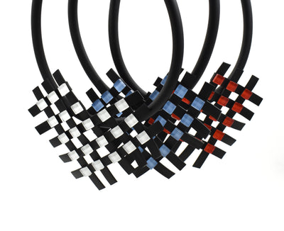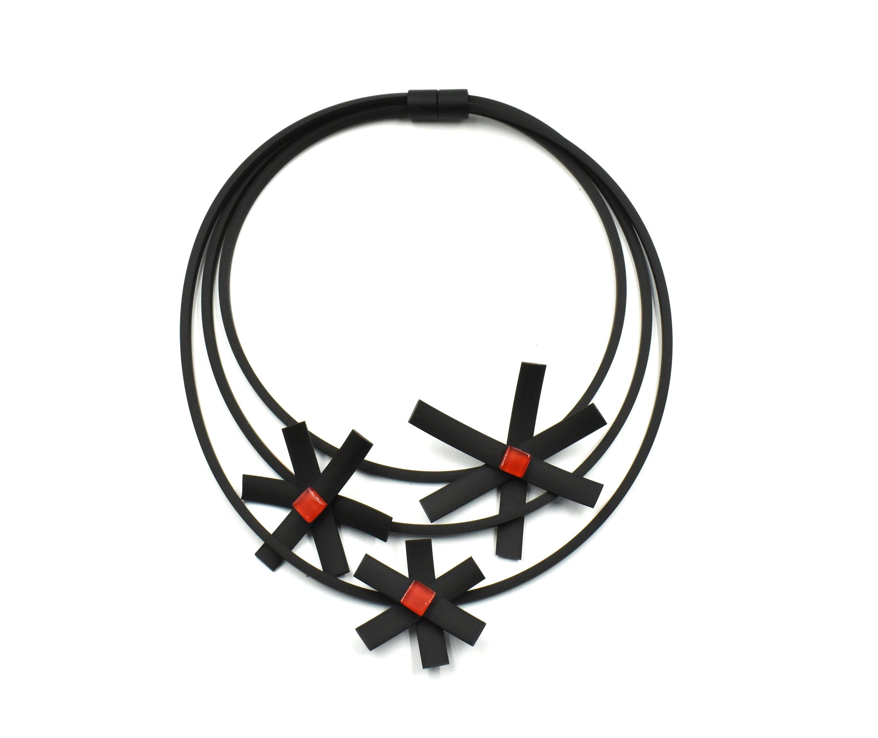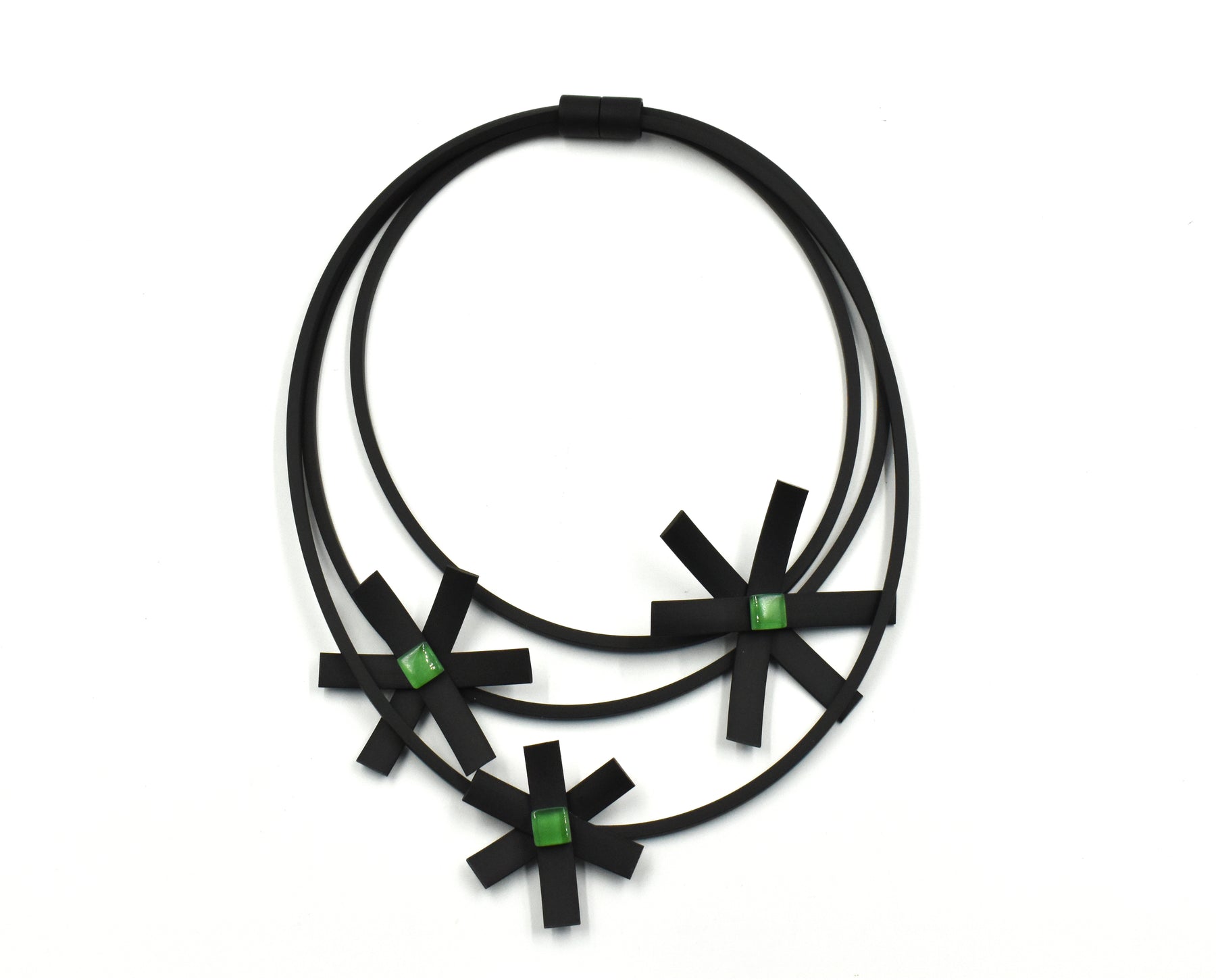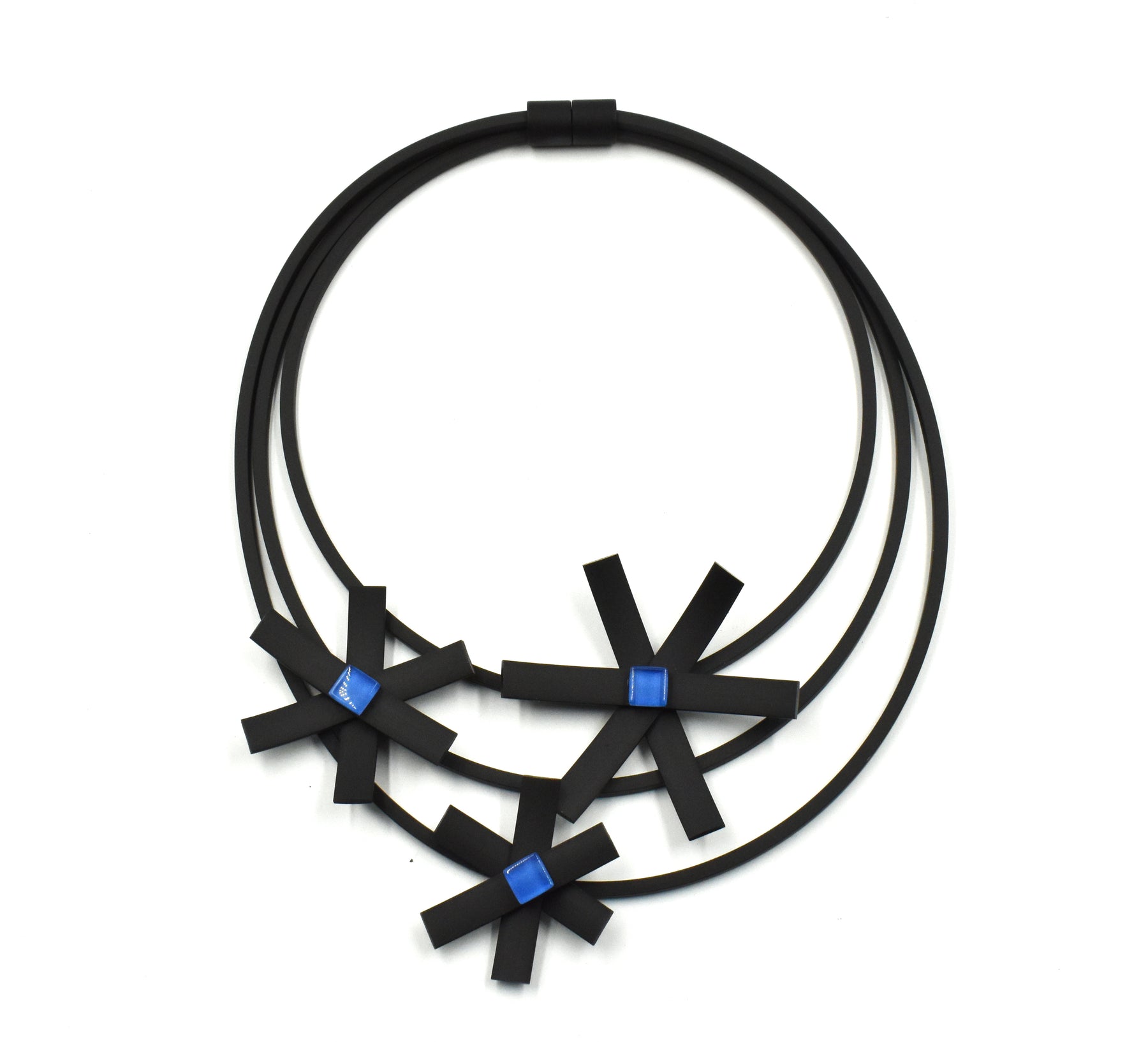 Elevate your style with this handmade contemporary necklace, a striking statement piece that blends modern design with timeless elegance. Crafted with sleek black lines of rubber that gracefully curve, each strand is accented with a polished sphere, creating a unique balance of geometry and movement.