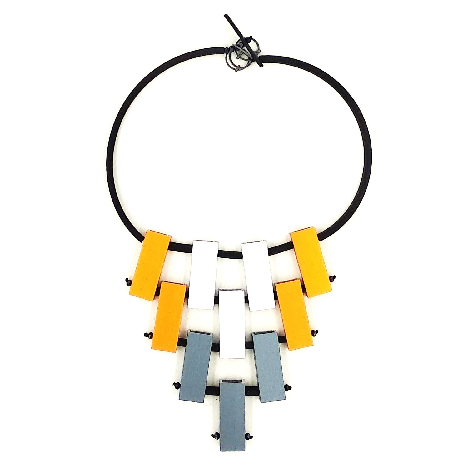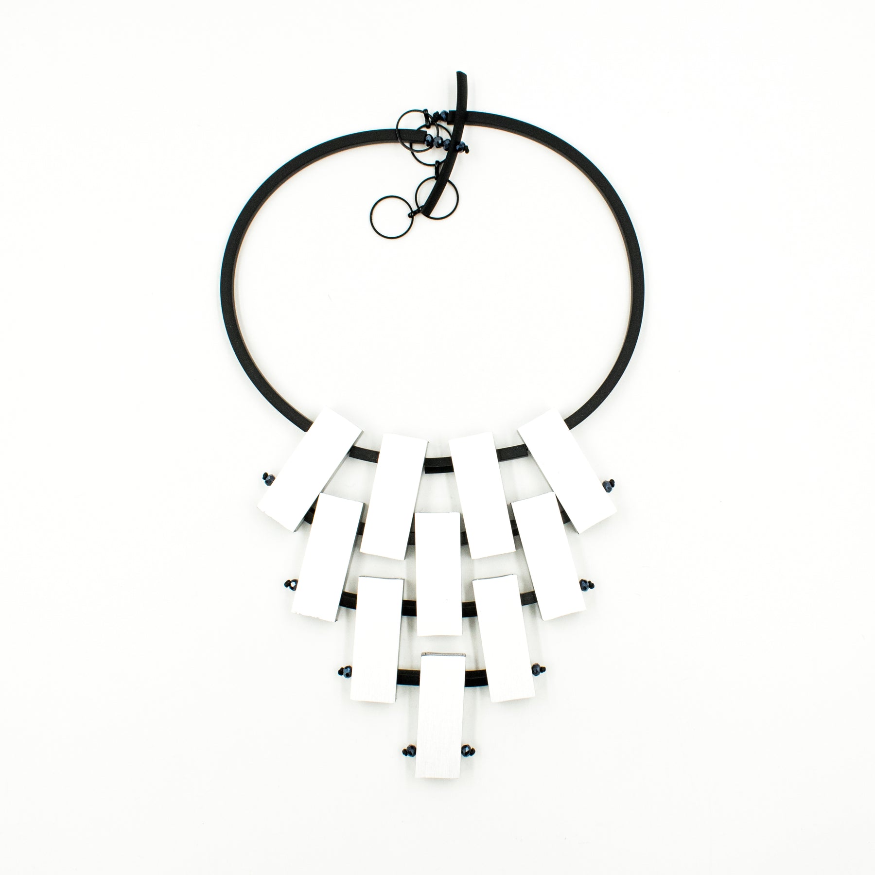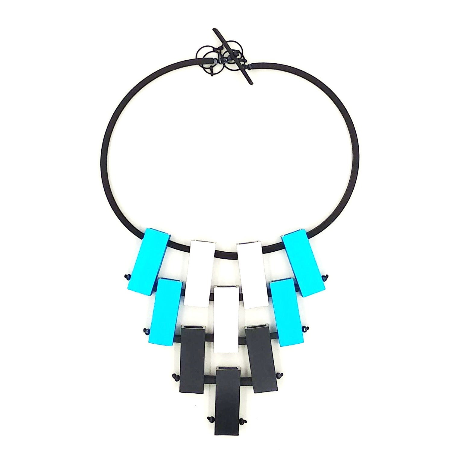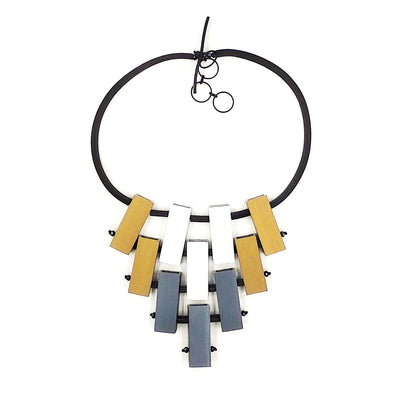The Urban Abstract necklace brings a playful twist to urban chic. With its bold geometric lines and staggered aluminium cubes, this necklace adds a dash of edgy fun to your look. The sleek black rubber contrasts perfectly with the shiny metal, creating a dynamic accessory that’s as comfortable as it is eye-catching.