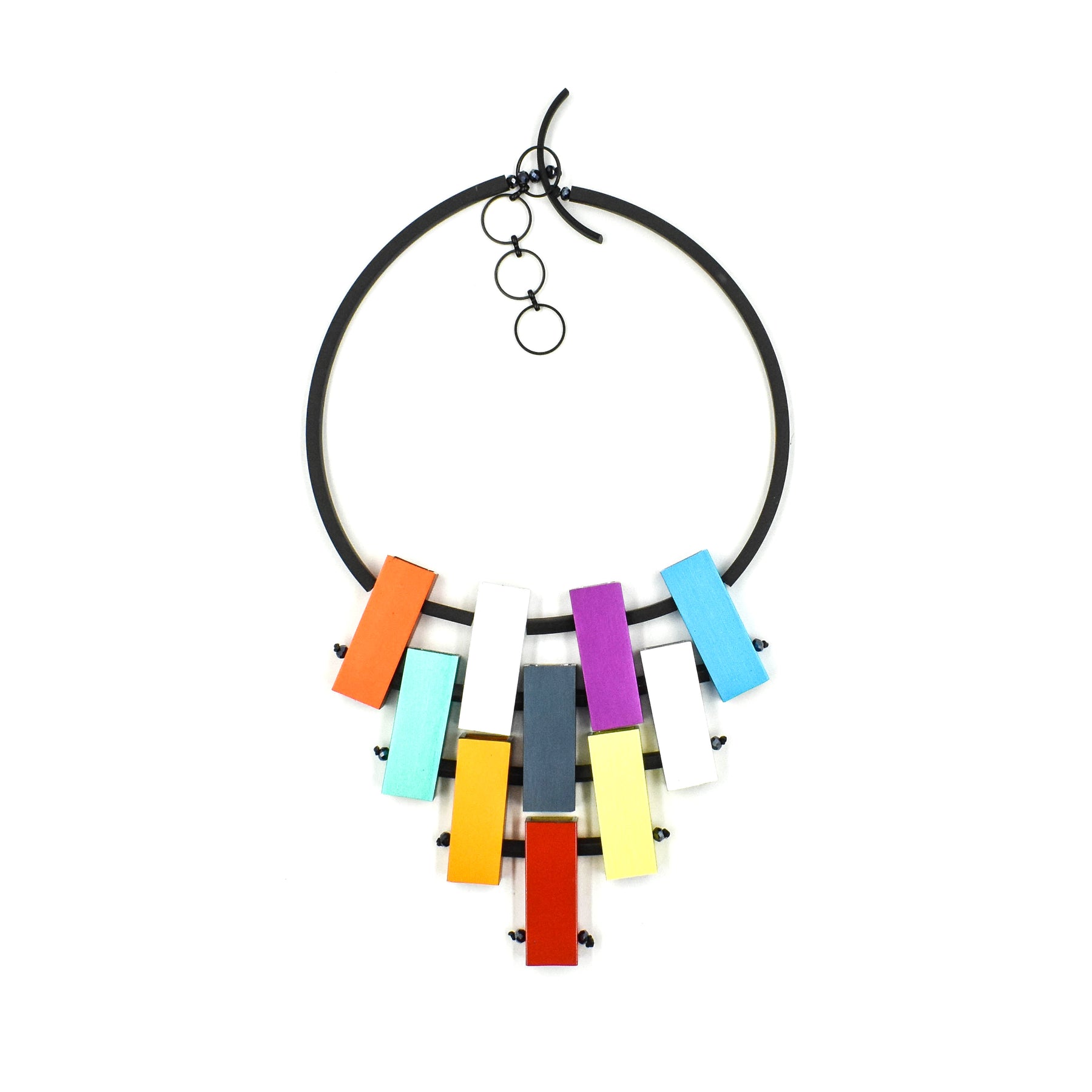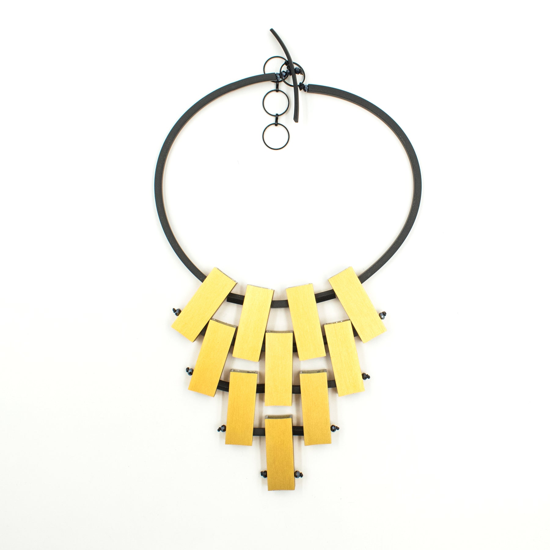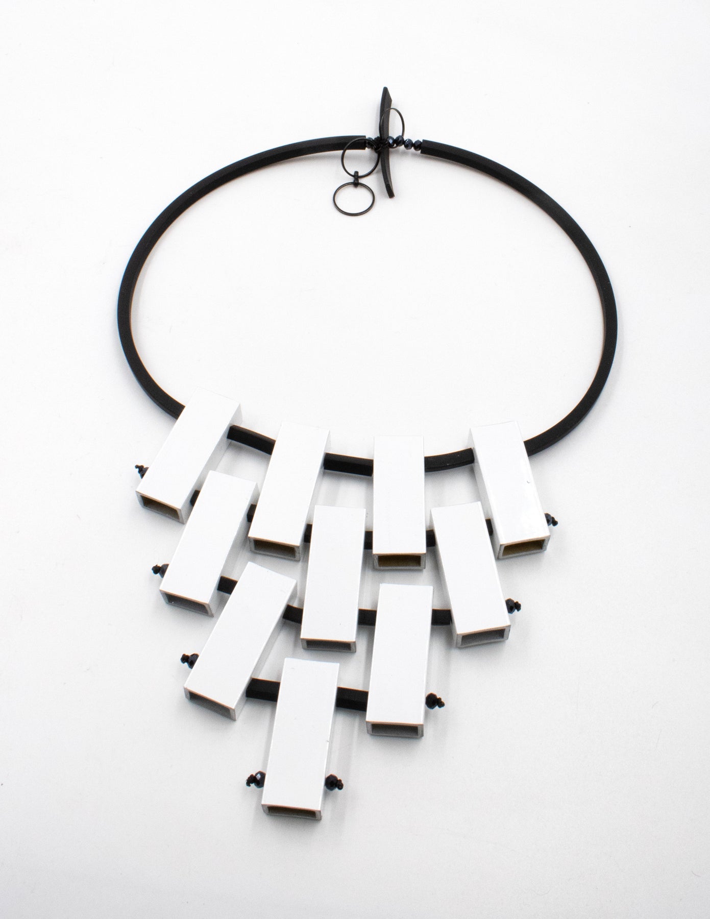 The Urban Abstract necklace brings a playful twist to urban chic. With its bold geometric lines and staggered aluminium cubes, this necklace adds a dash of edgy fun to your look. The sleek black rubber contrasts perfectly with the shiny metal, creating a dynamic accessory that’s as comfortable as it is eye-catching.